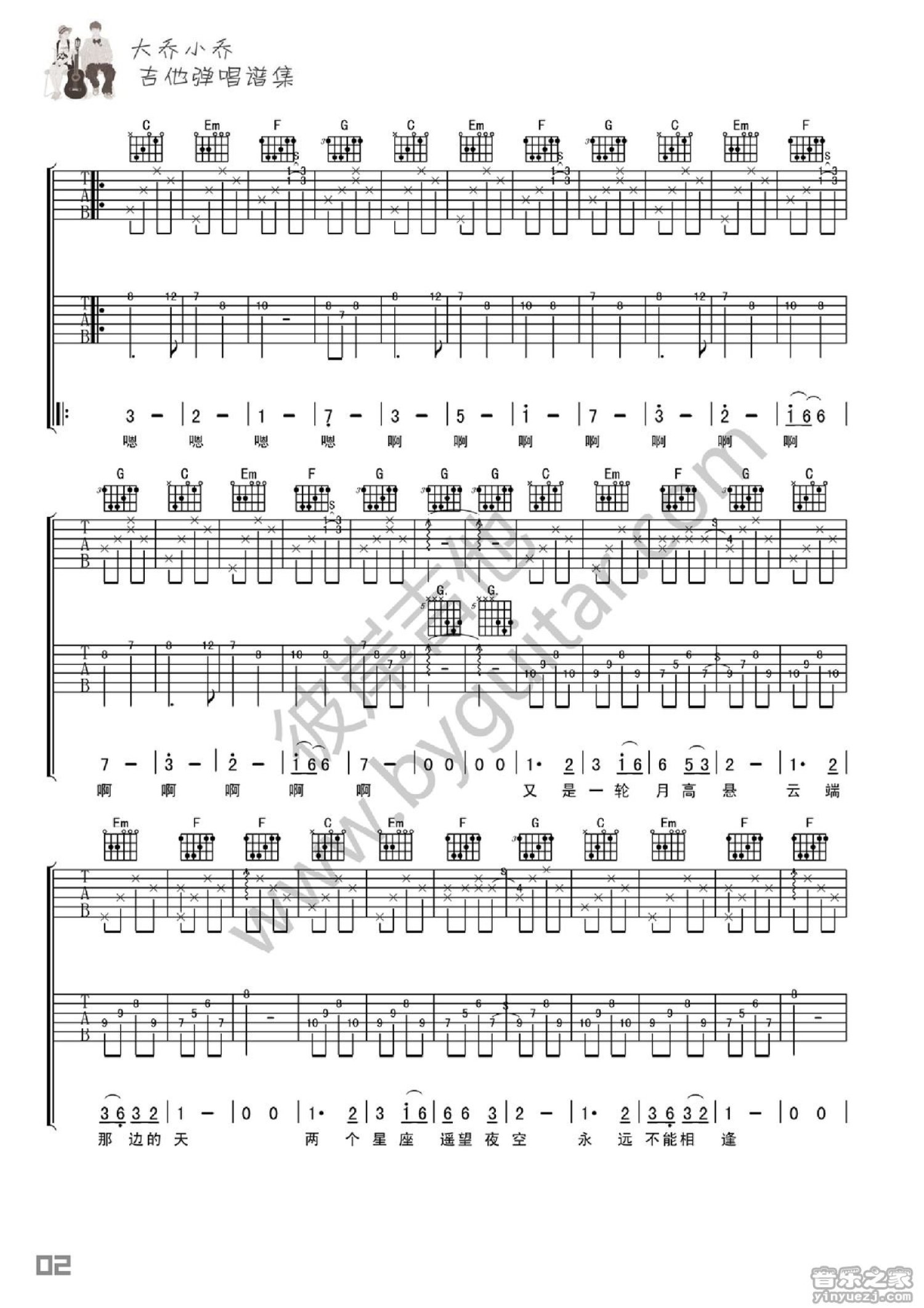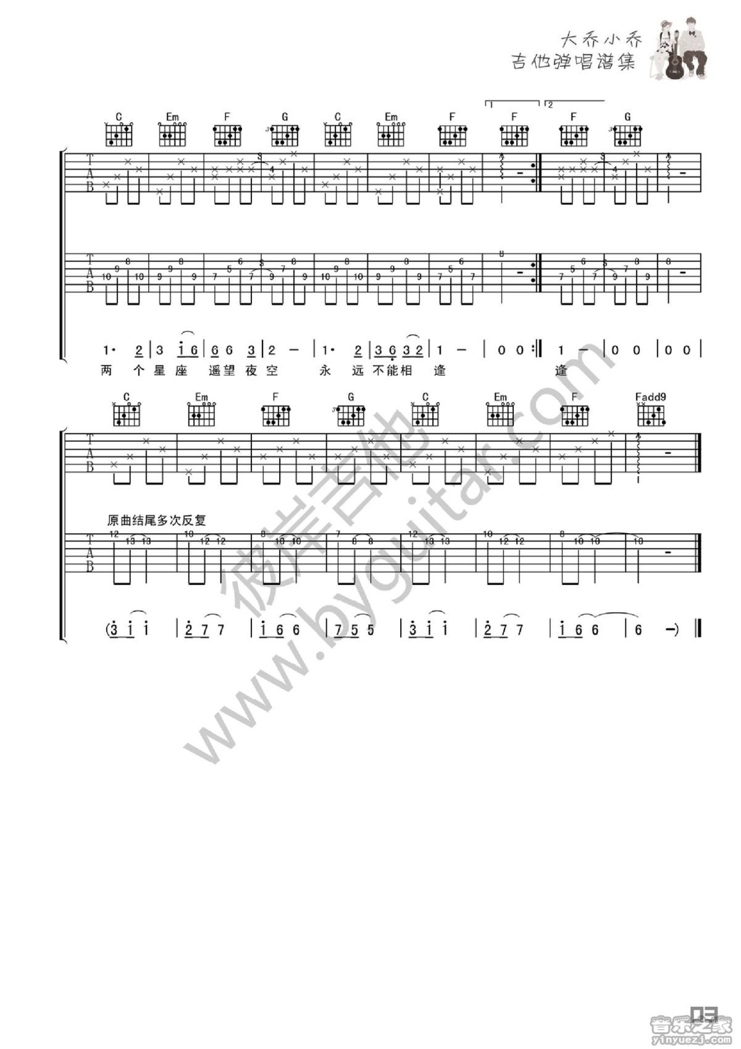 曲谱介绍: C调《星座》吉他弹唱六线谱