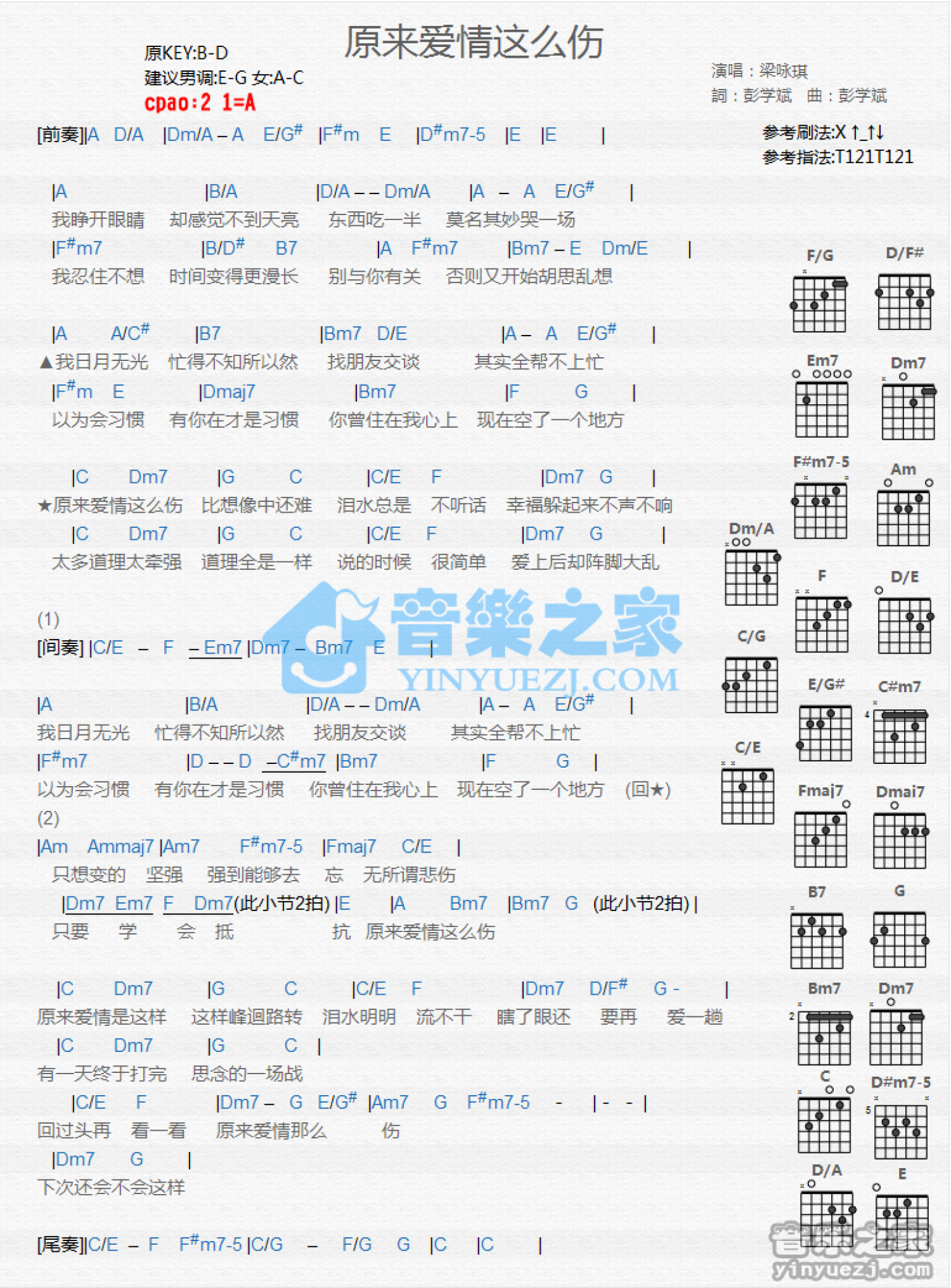 曲谱介绍: A调版《原来爱情这么伤》吉他和弦弹唱谱