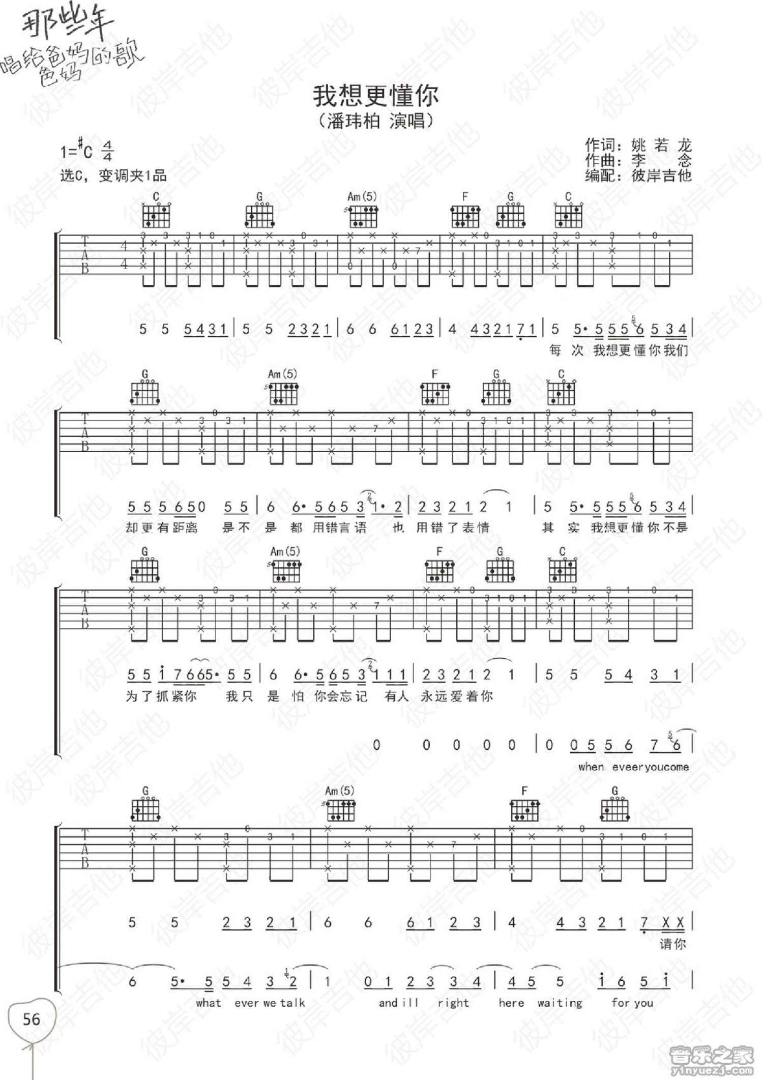 曲谱介绍: C调版《我想更懂你》吉他弹唱六线谱