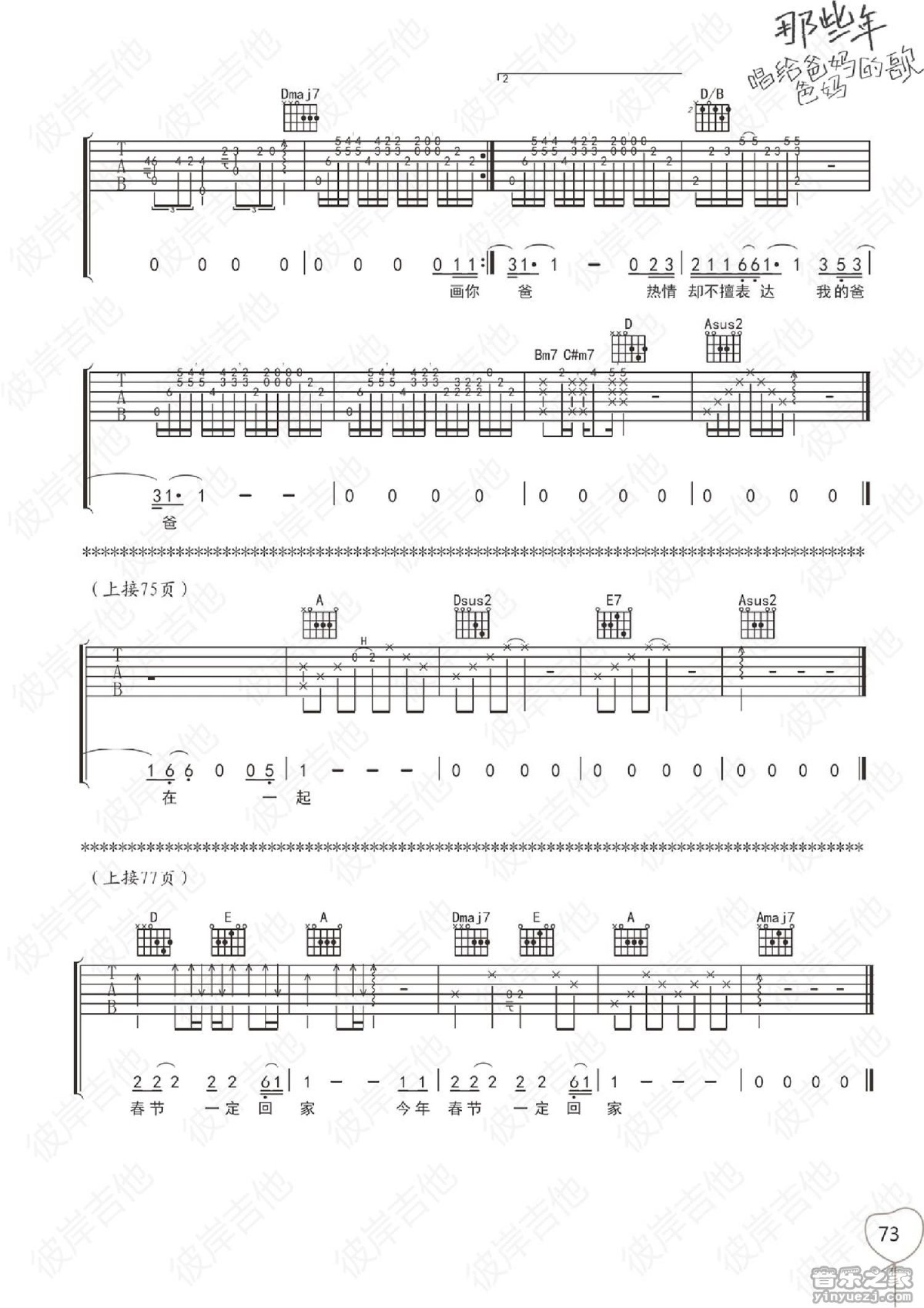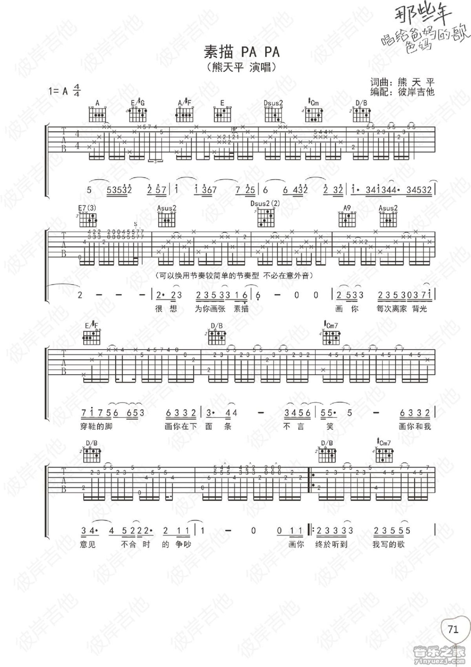 曲谱介绍: A调版《素描PAPA》吉他弹唱六线谱