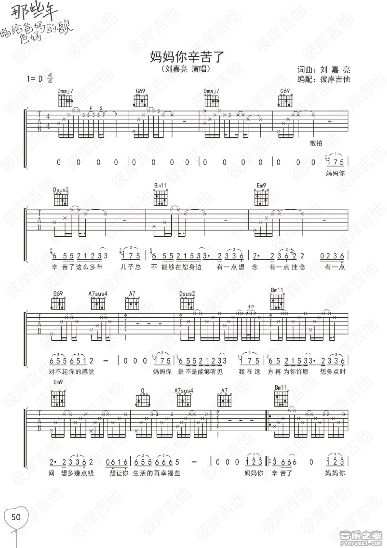 曲谱介绍: D调版《妈妈你辛苦了》吉他弹唱六线谱