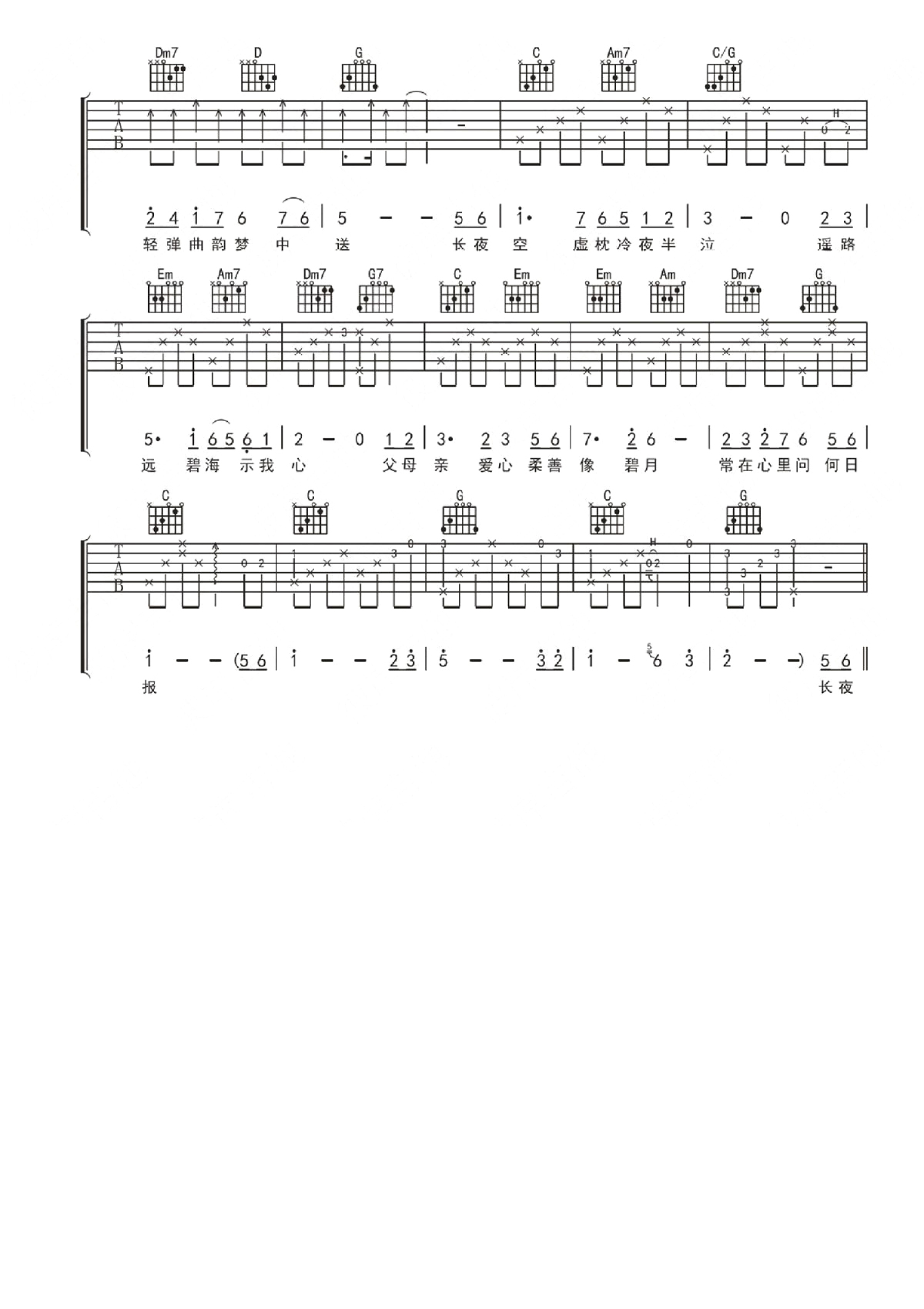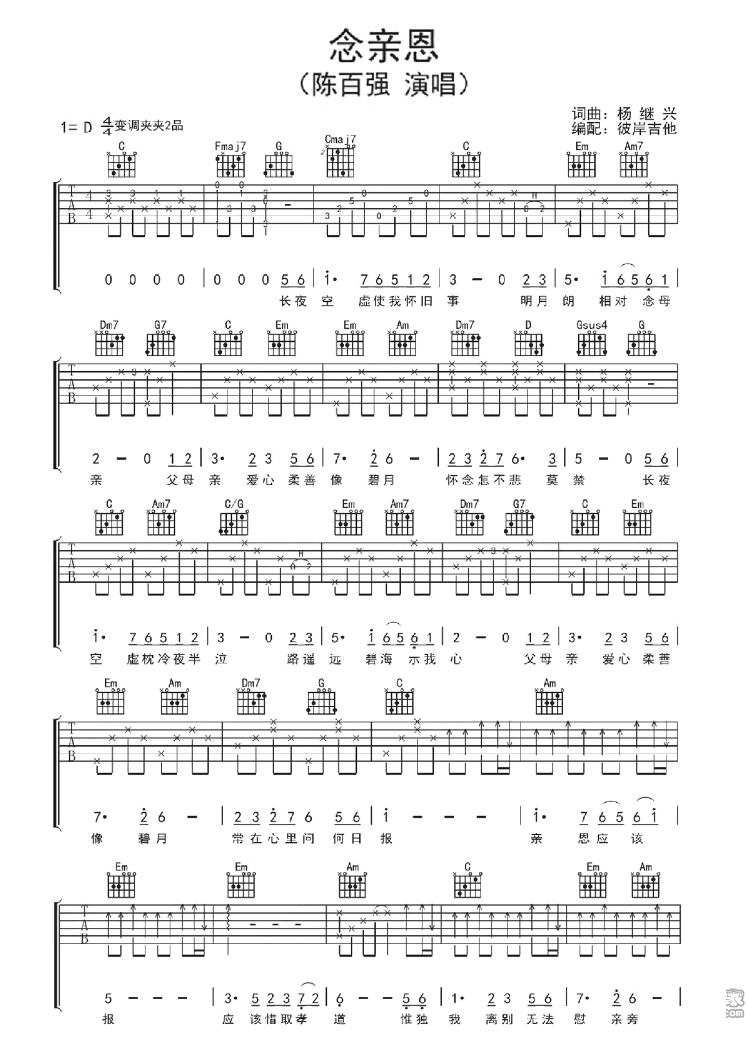 曲谱介绍: D调版《念亲恩》吉他弹唱六线谱