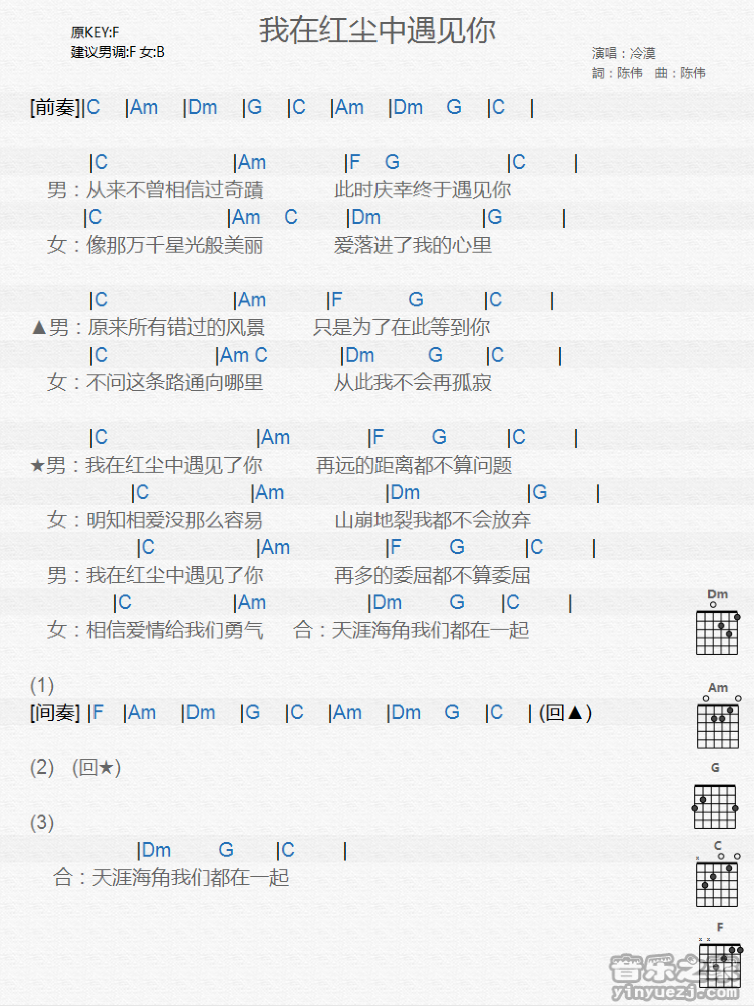 曲谱介绍: F调版《我在红尘中遇见你》吉他和弦弹唱谱