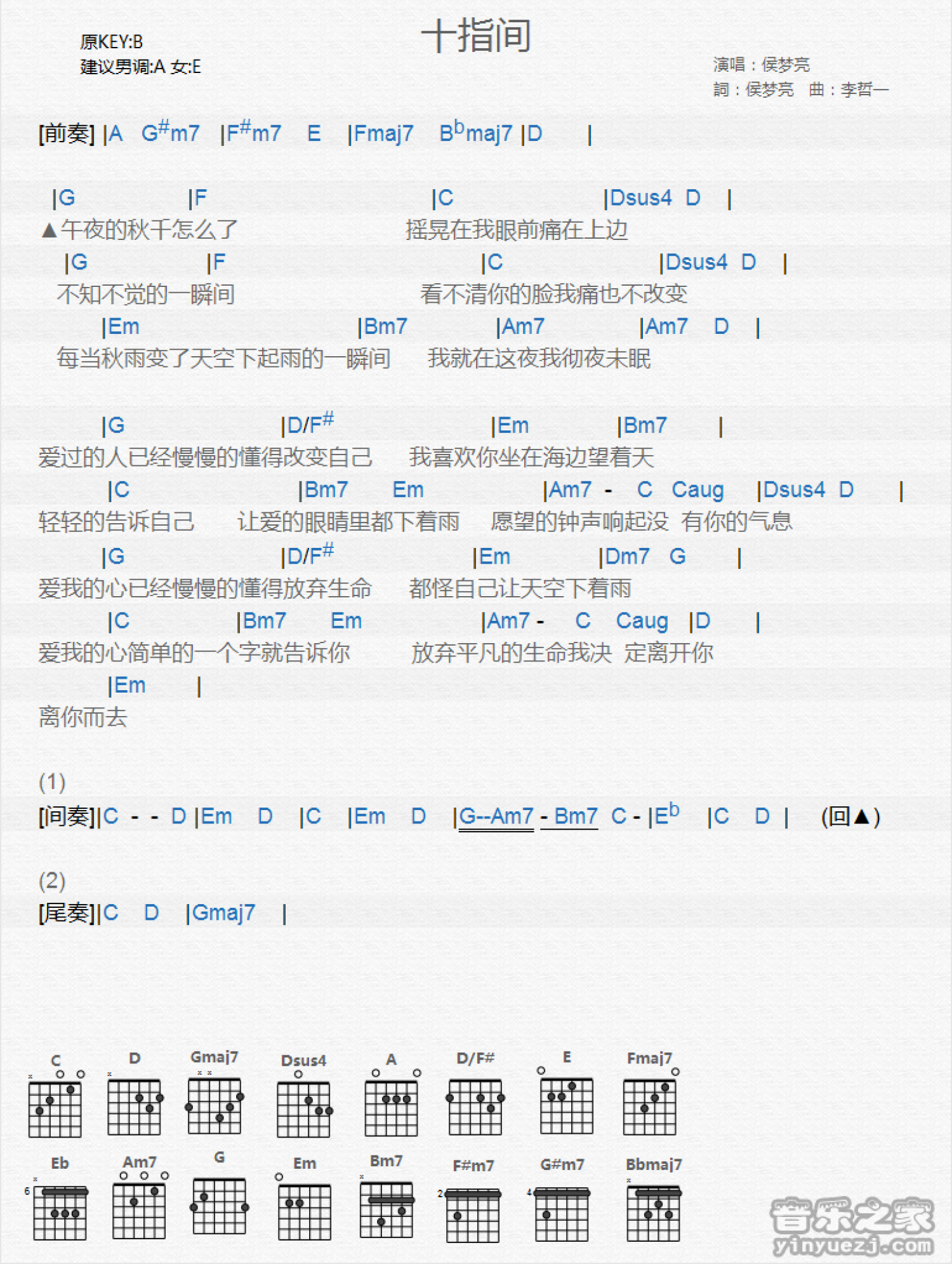 十指间吉他谱 - 侯梦亮 - B调吉他弹唱谱 - 和弦谱