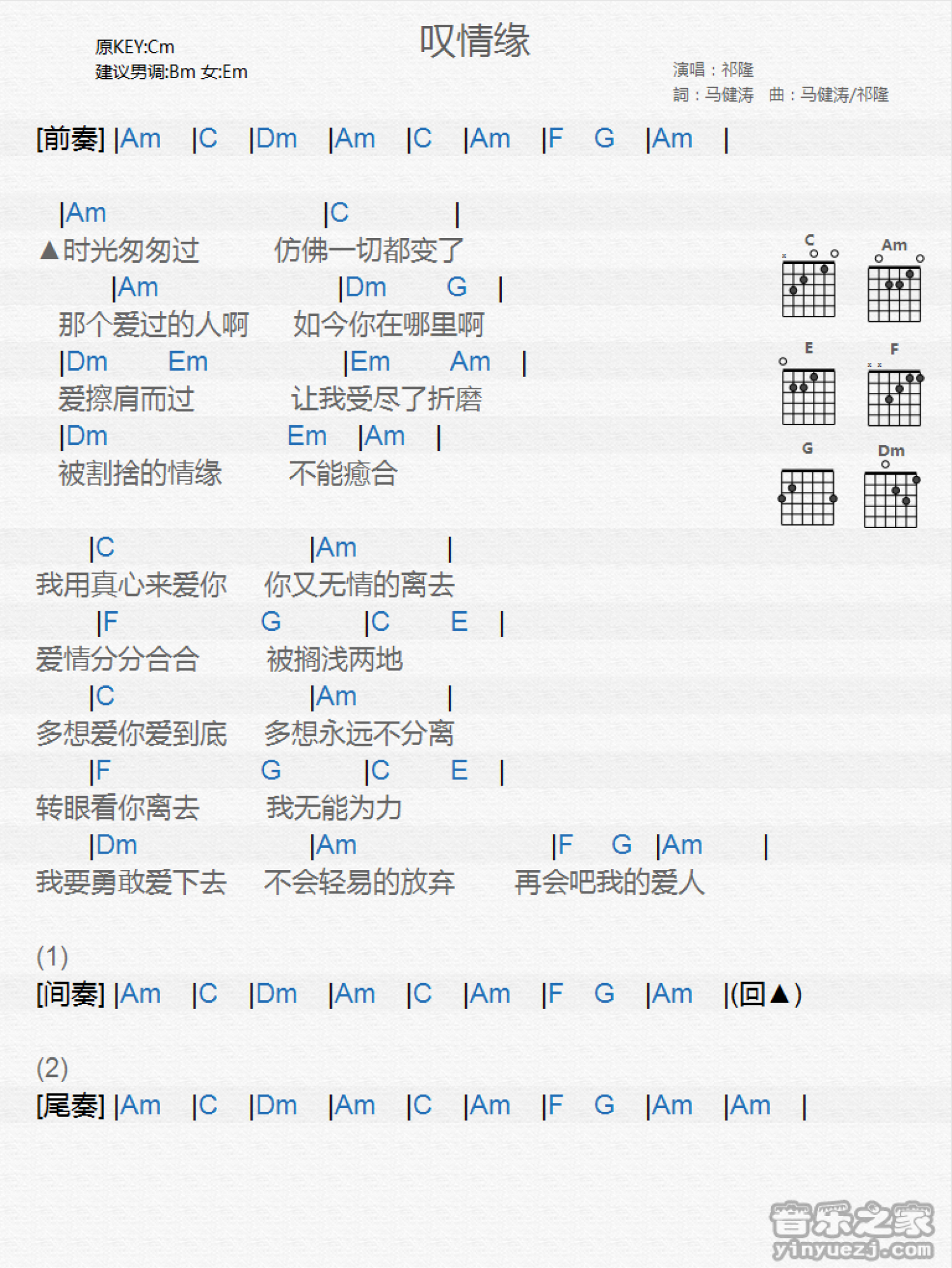 叹情缘吉他谱 - 祁隆 - C调吉他弹唱谱 - 和弦谱
