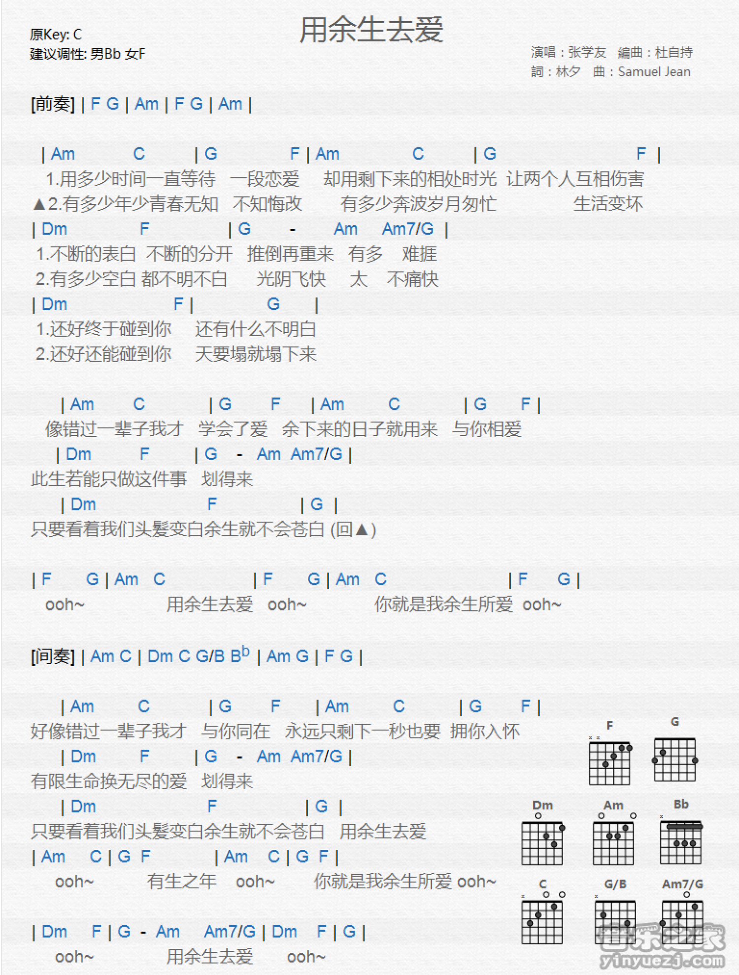 曲谱介绍: C调版《用余生去爱》吉他和弦弹唱谱