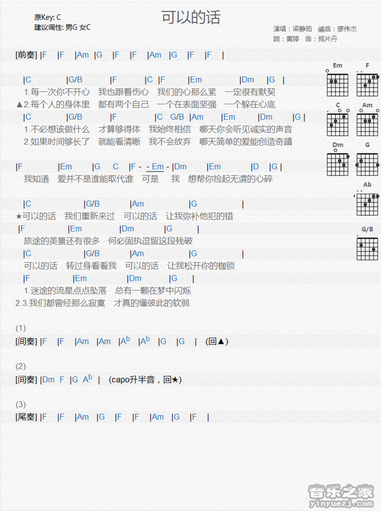 曲谱介绍: C调版《可以的话》吉他和弦弹唱谱
