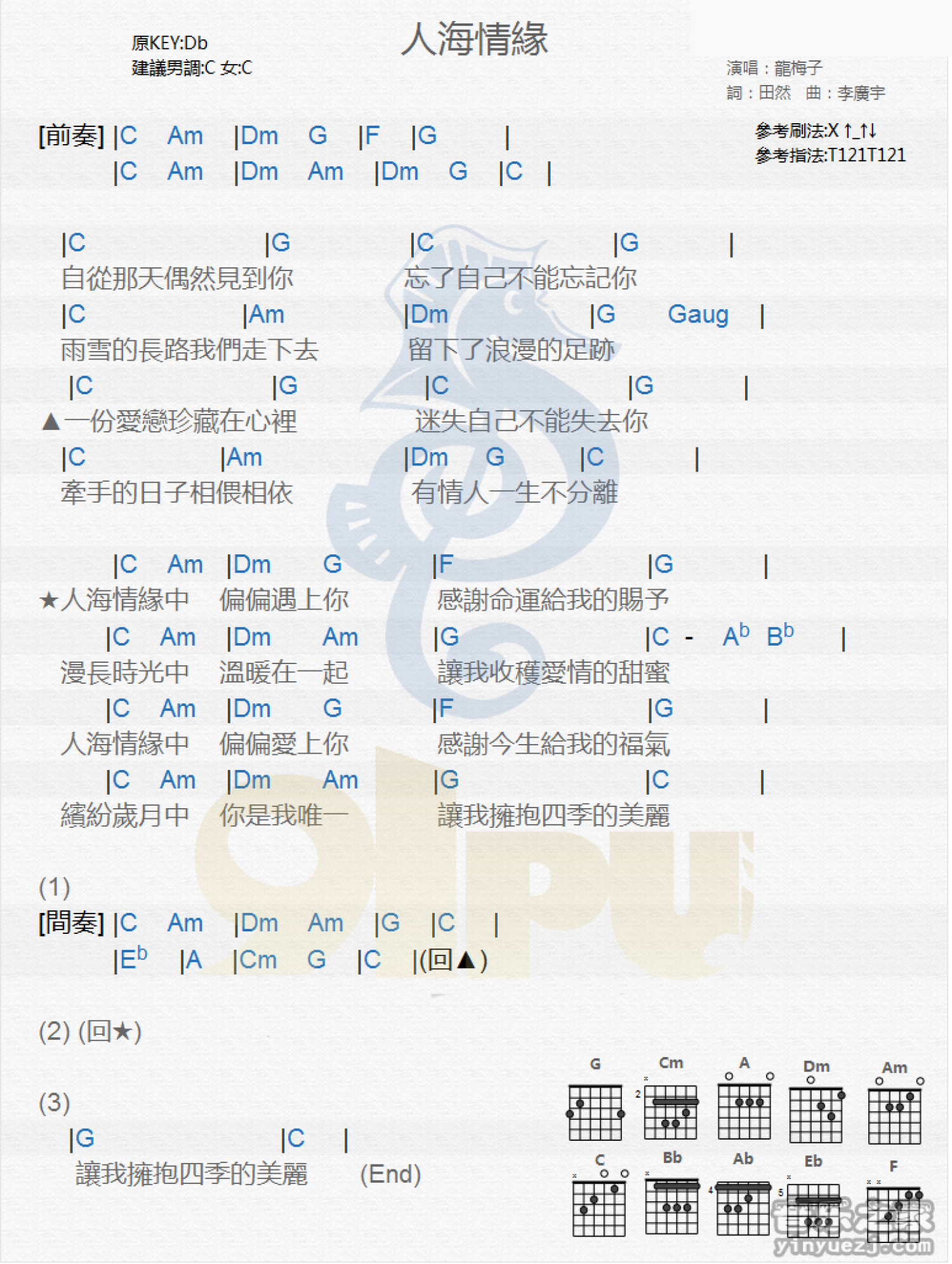 曲谱介绍: bD调版《人海情缘》吉他和弦弹唱谱