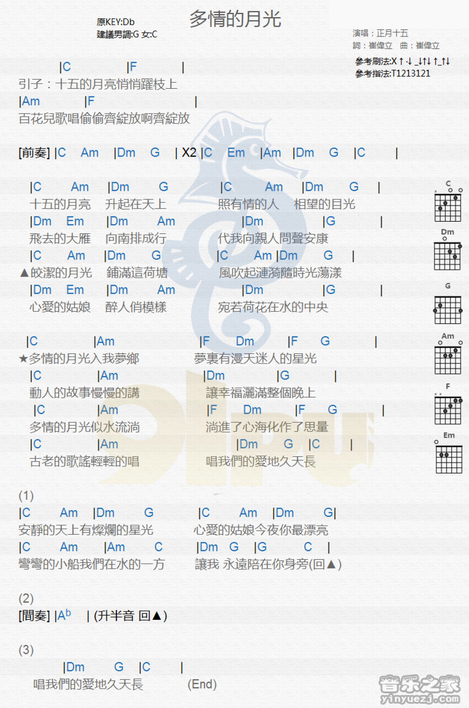 曲谱介绍: bD调版《多情的月光》吉他和弦弹唱谱