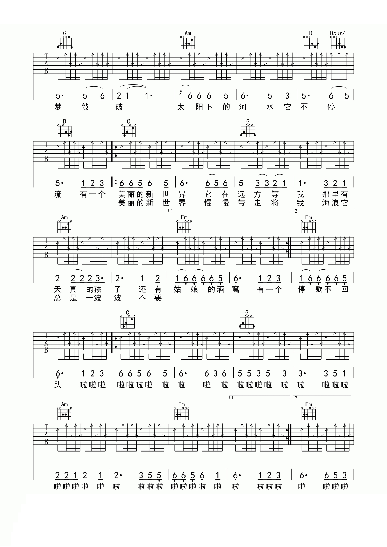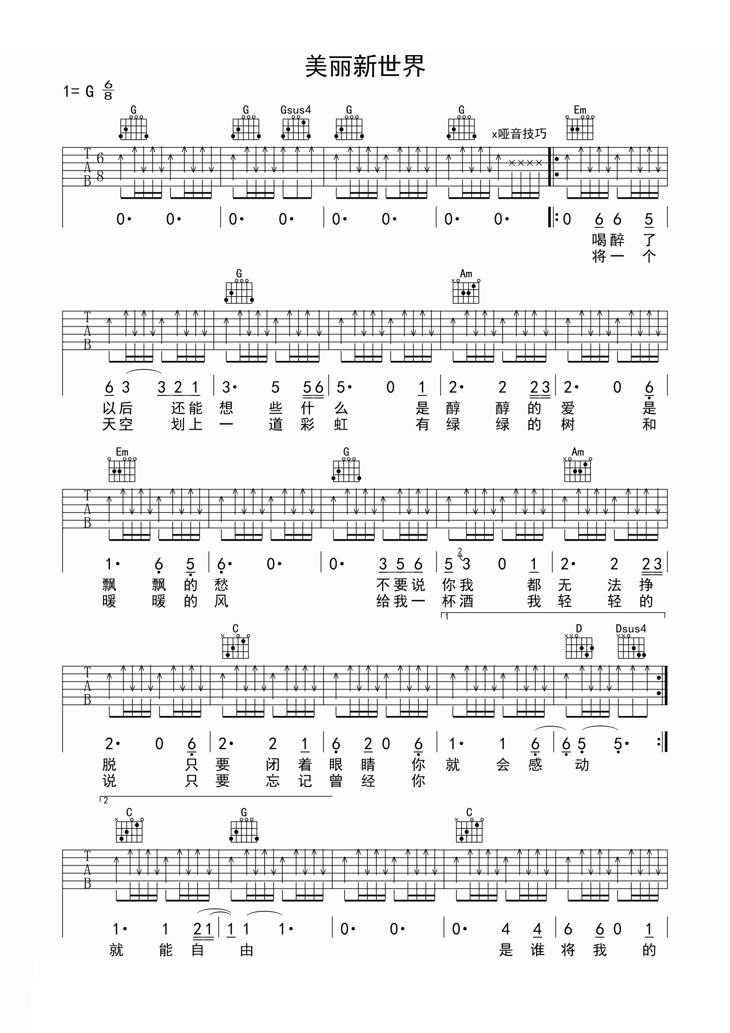 曲谱介绍: 美丽新世界吉他谱 伍佰 G调高清弹唱谱