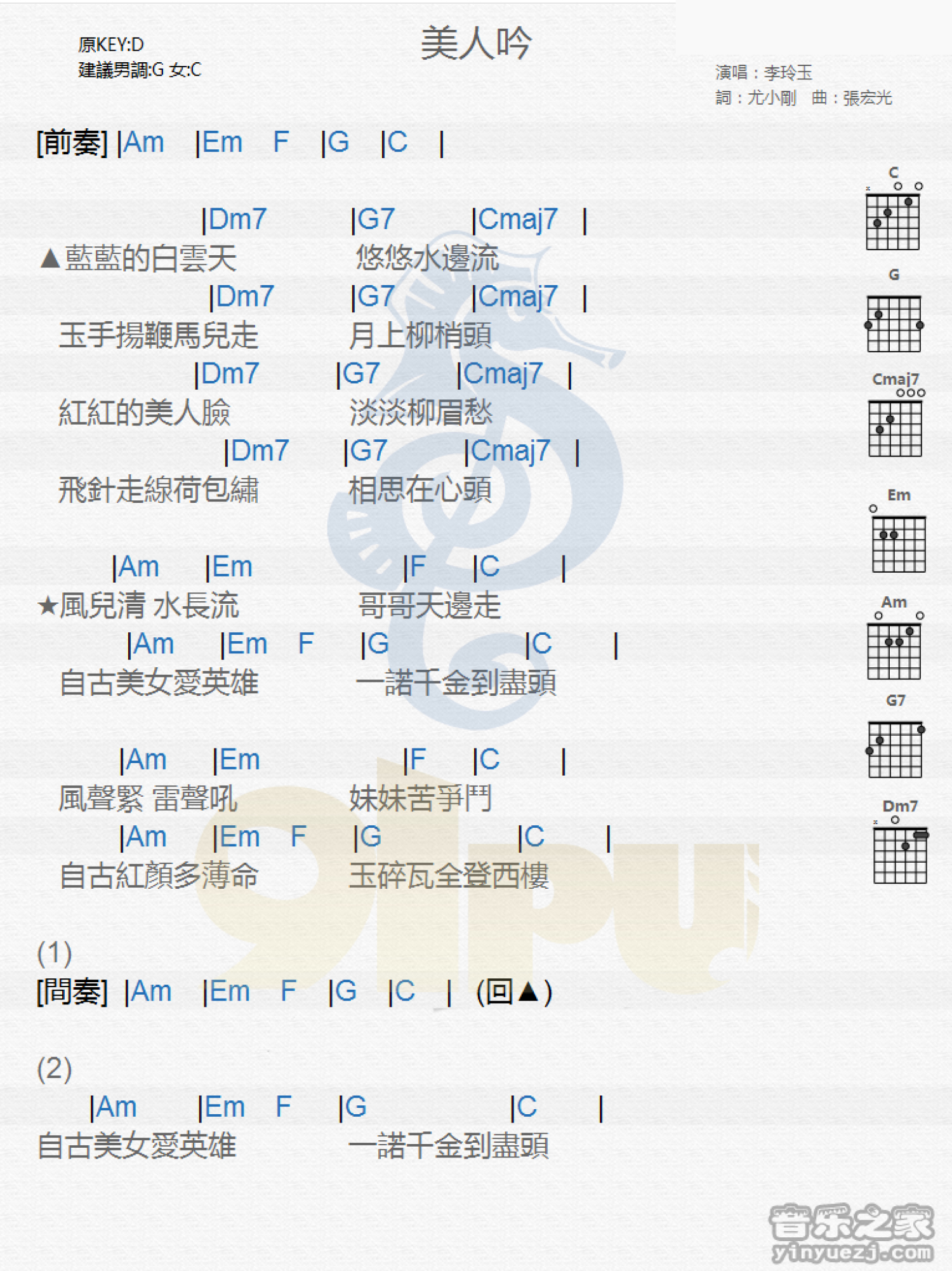 曲谱介绍: D调版《美人吟》吉他和弦弹唱谱