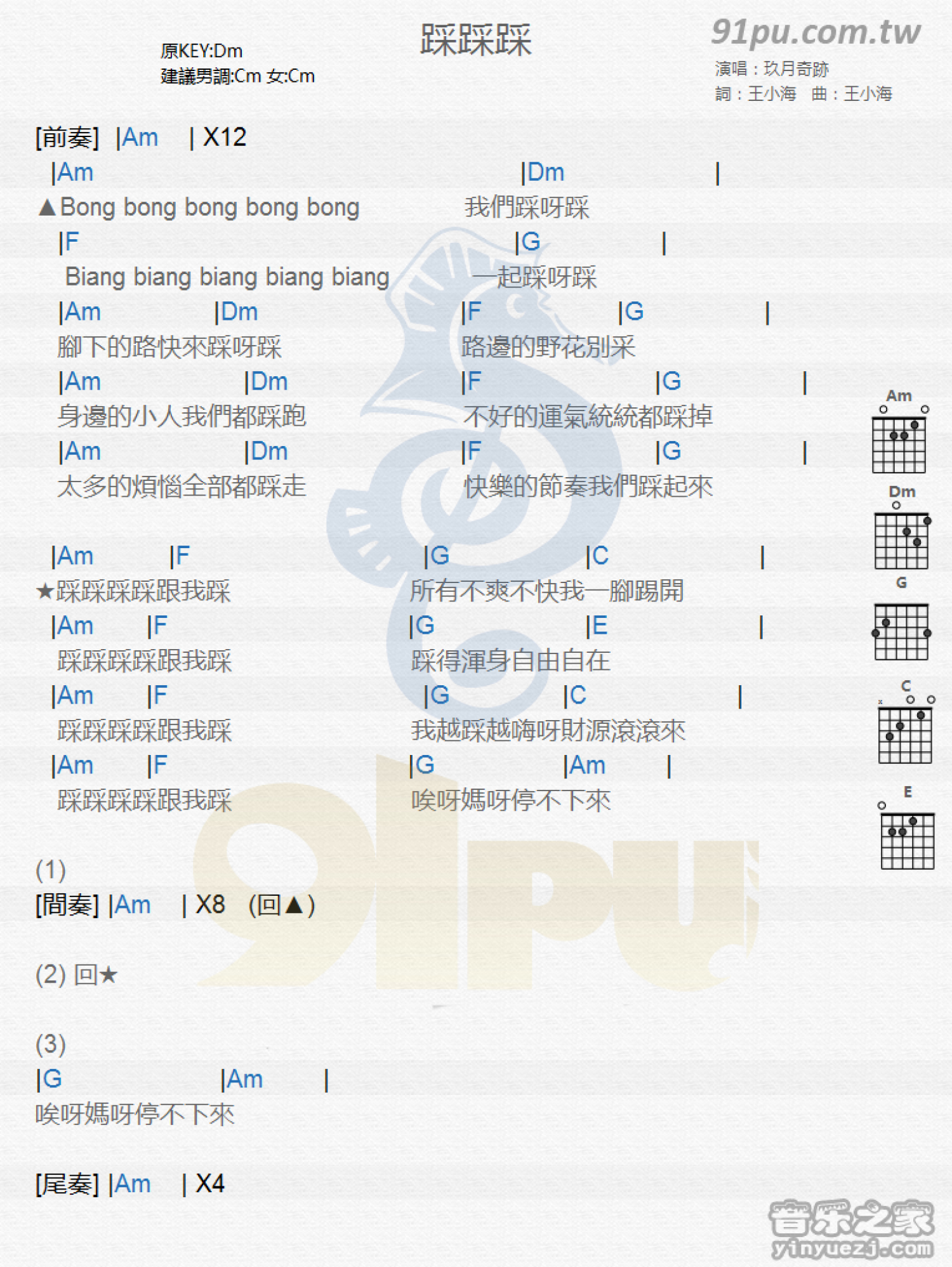 曲谱介绍: Dm调版《踩踩踩》吉他和弦弹唱谱