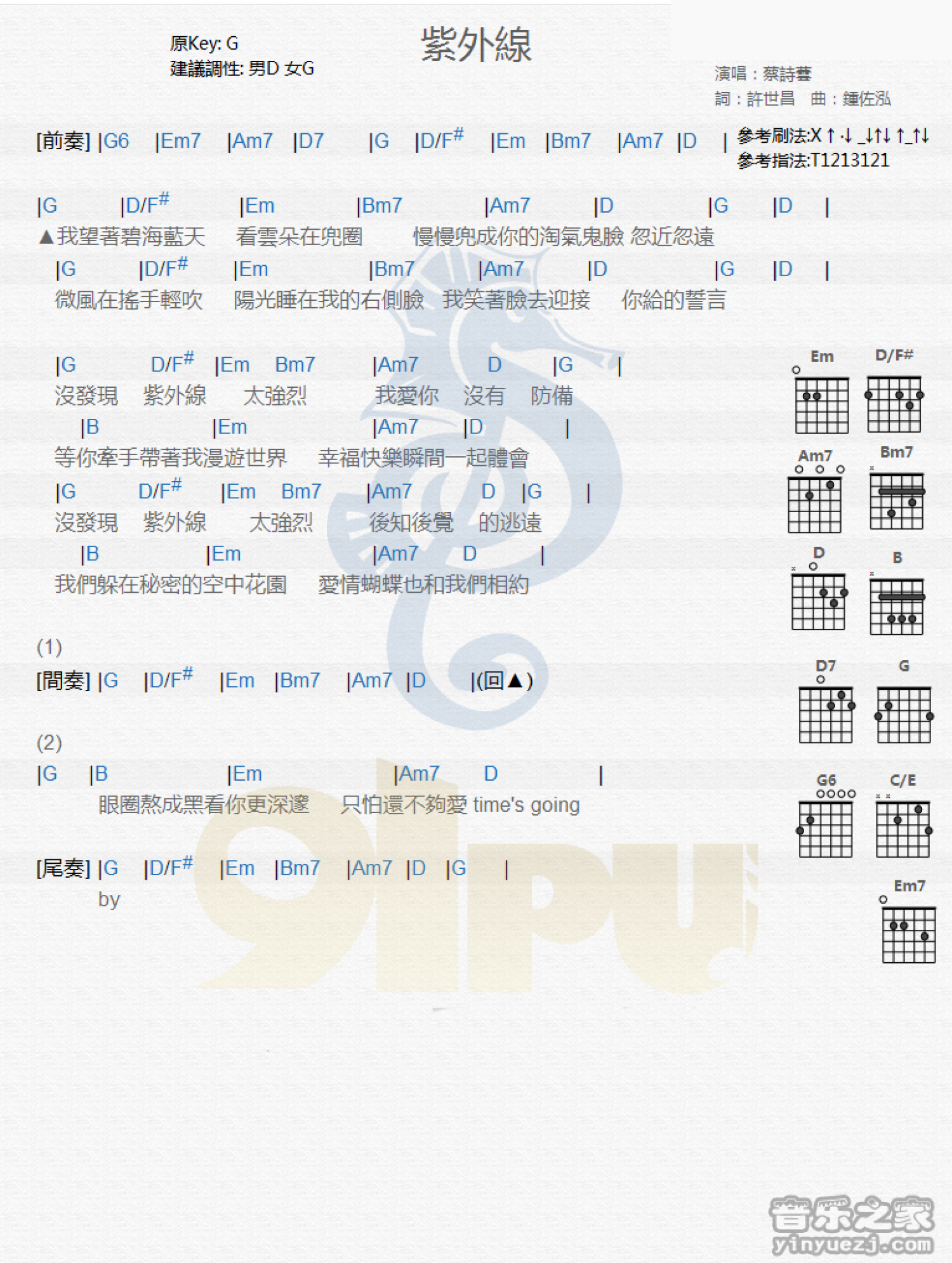 曲谱介绍: G调版《紫外线》吉他和弦弹唱谱