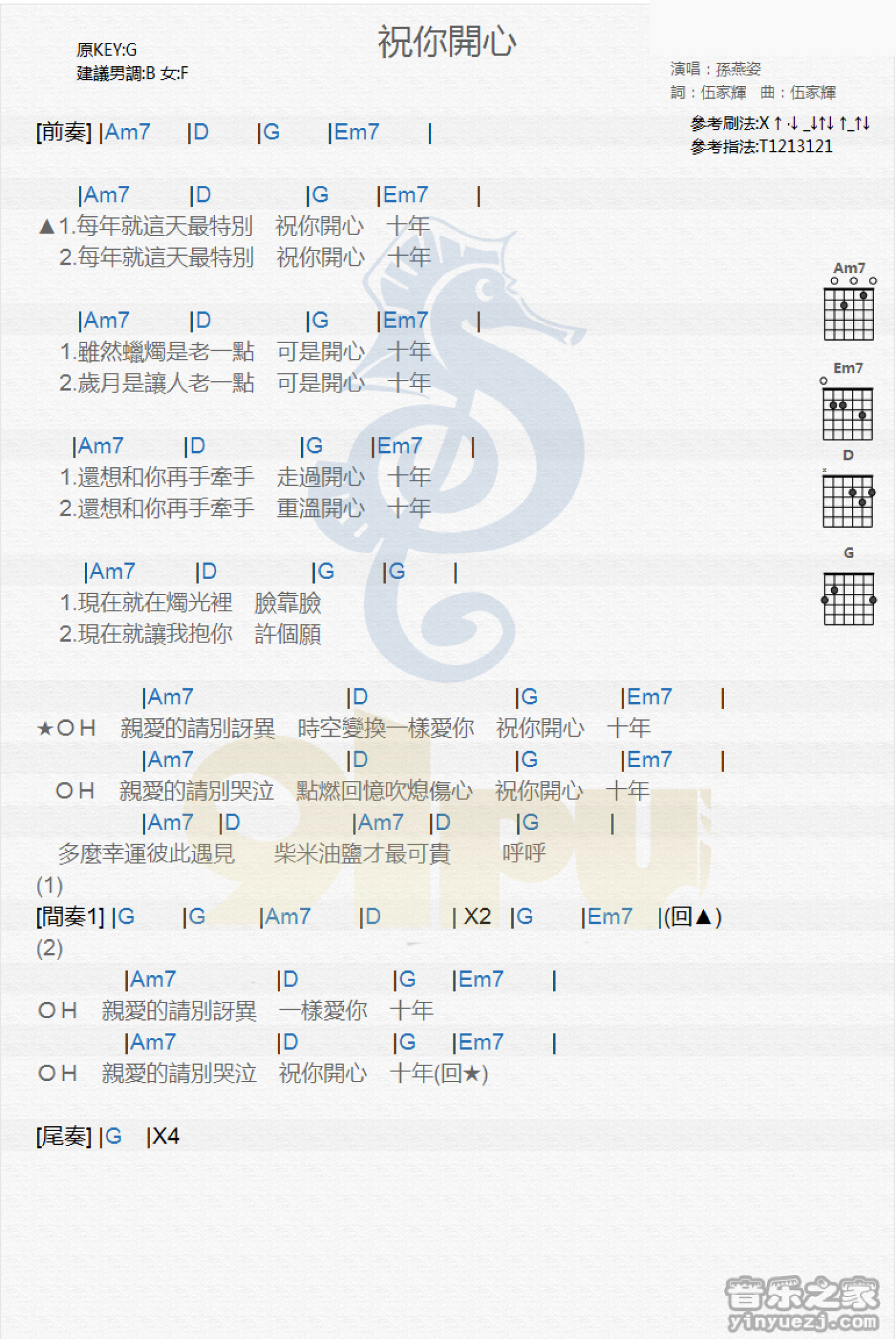 曲谱介绍: G调版《祝你开心》吉他和弦弹唱谱