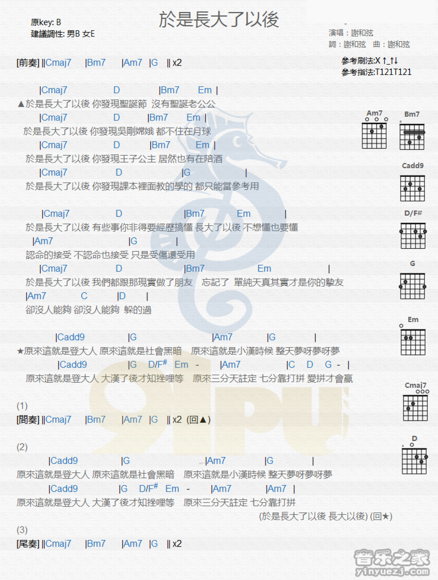 曲谱介绍: B调版《于是长大了以后》吉他和弦弹唱谱