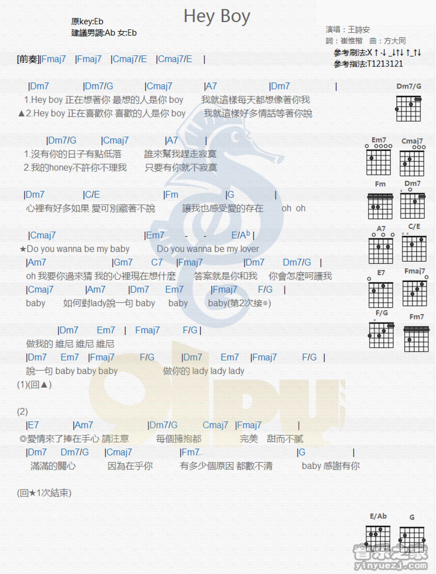 Hey Boy吉他谱 - 王诗安 - 吉他弹唱谱 - 和弦谱