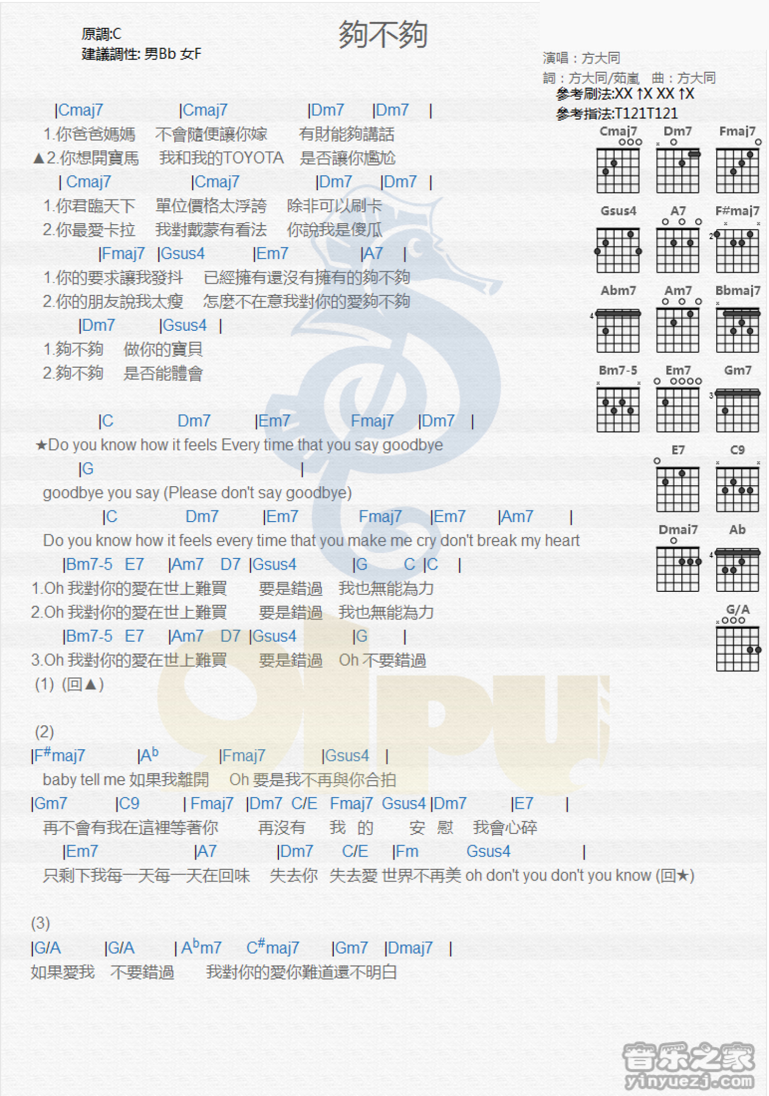 曲谱介绍: C调版《够不够》吉他和弦弹唱谱