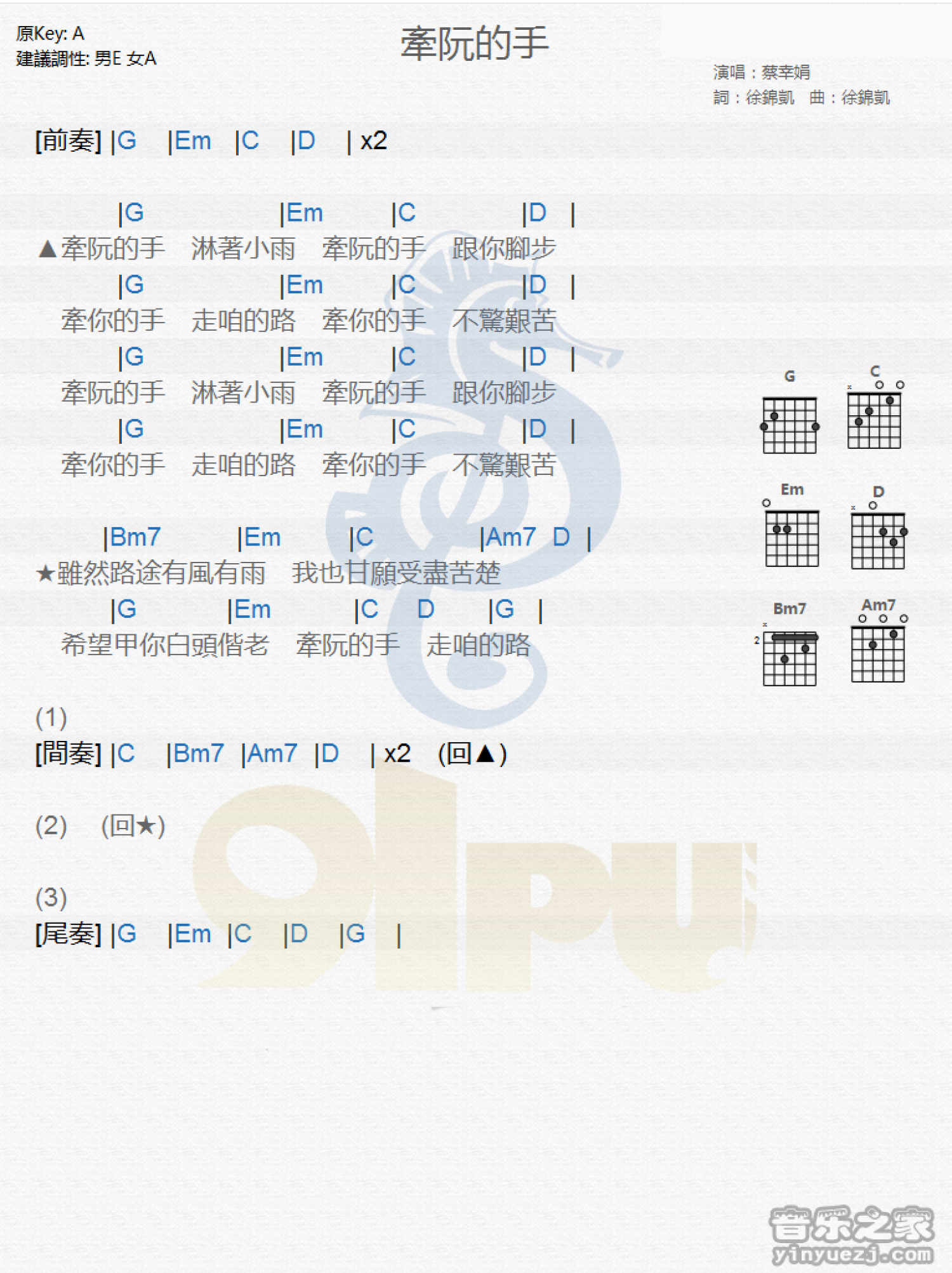 当前位置:琴谱网>吉他弹唱>牵阮的手