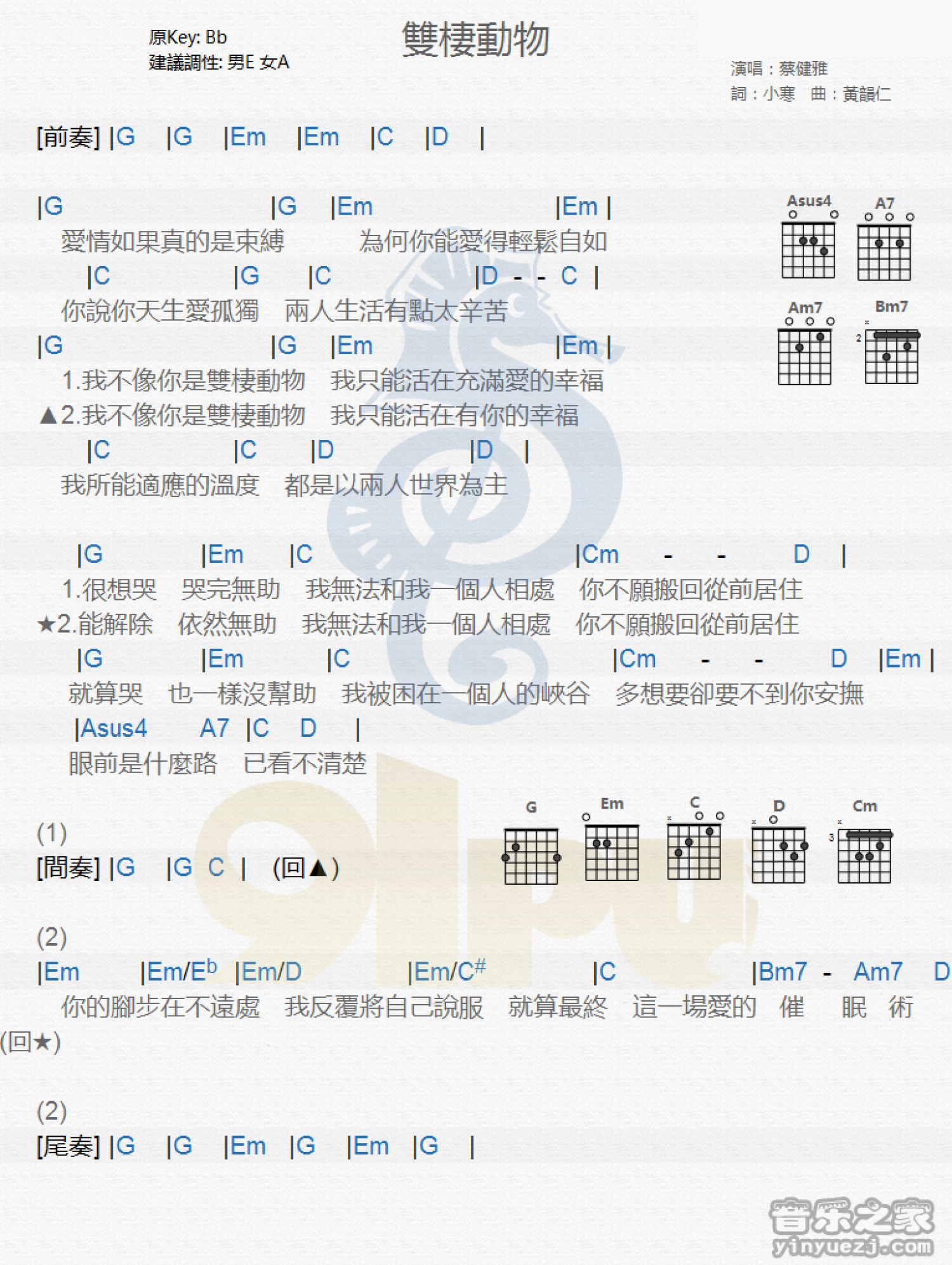 曲谱介绍: bB调版《双栖动物》吉他和弦弹唱谱