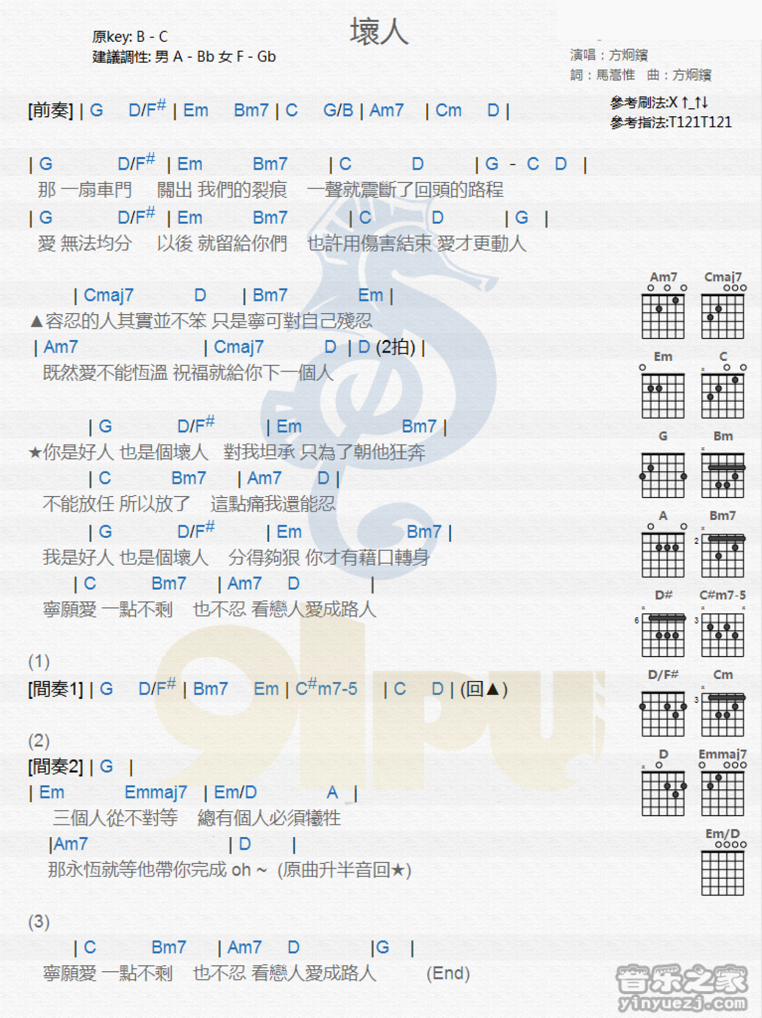 坏人吉他谱 - 方佟痘 - 吉他弹唱谱 - 和弦谱
