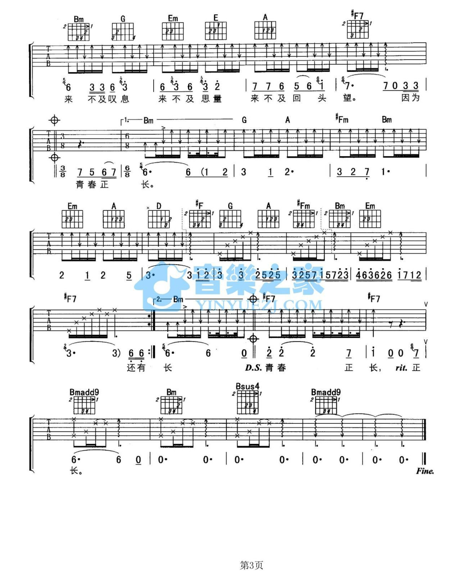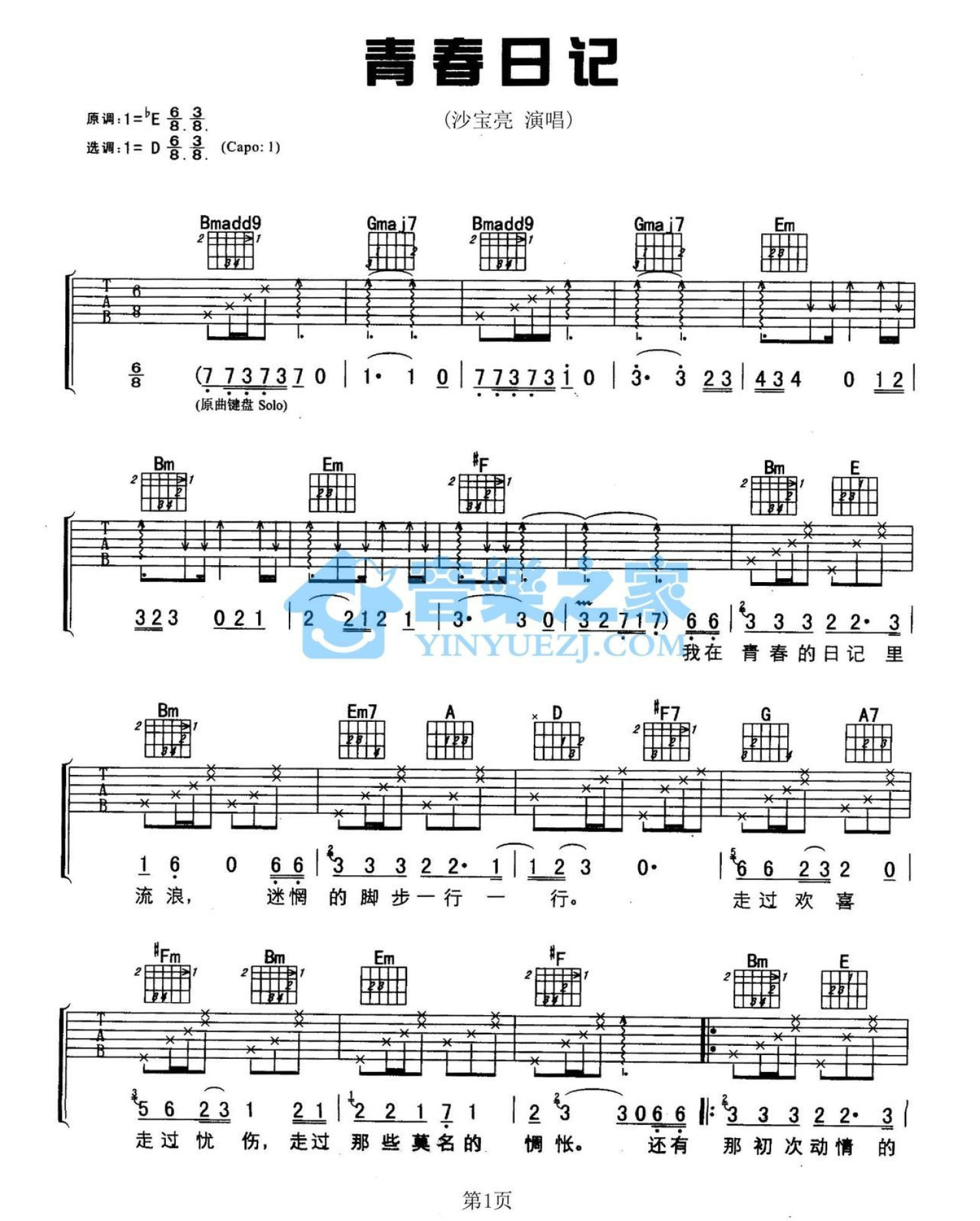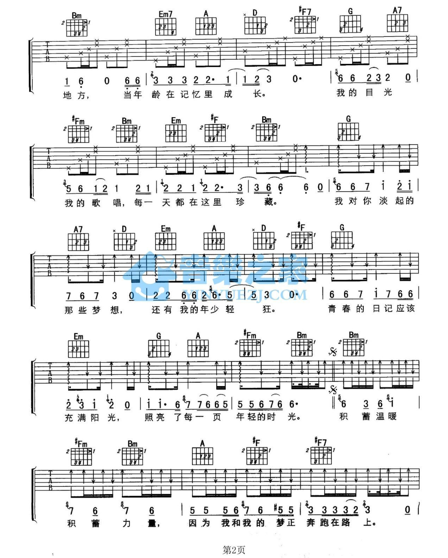曲谱介绍: D调版《青春日记》吉他弹唱六线谱