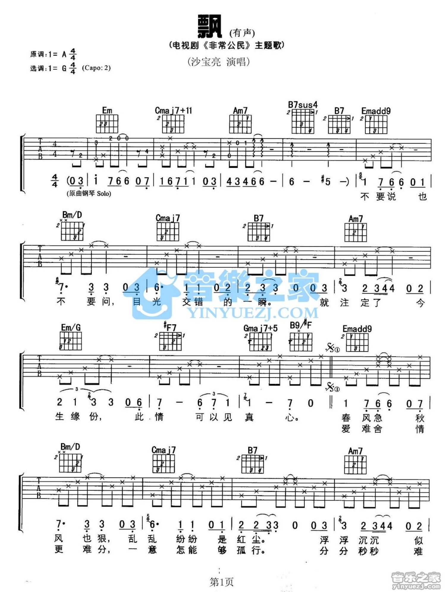 曲谱介绍: G调版《飘》吉他弹唱六线谱