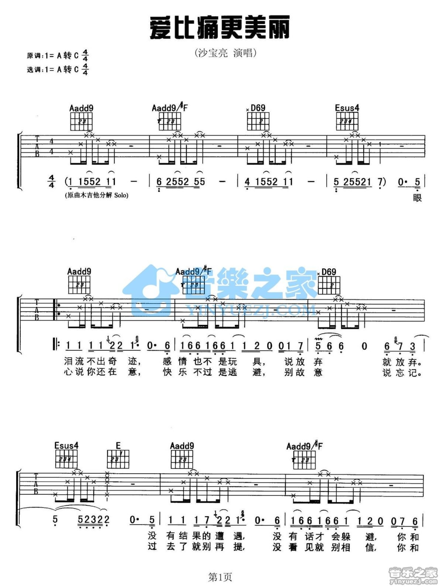 曲谱介绍: A调版《爱比痛更美丽》吉他弹唱六线谱