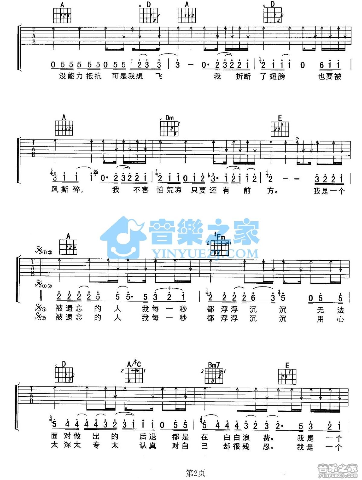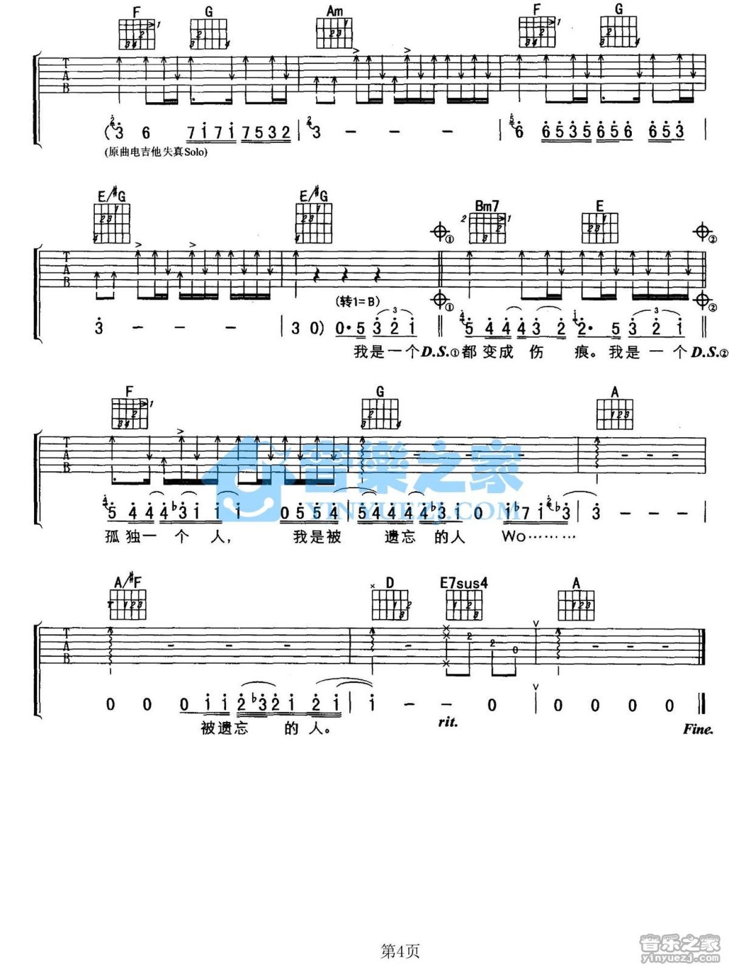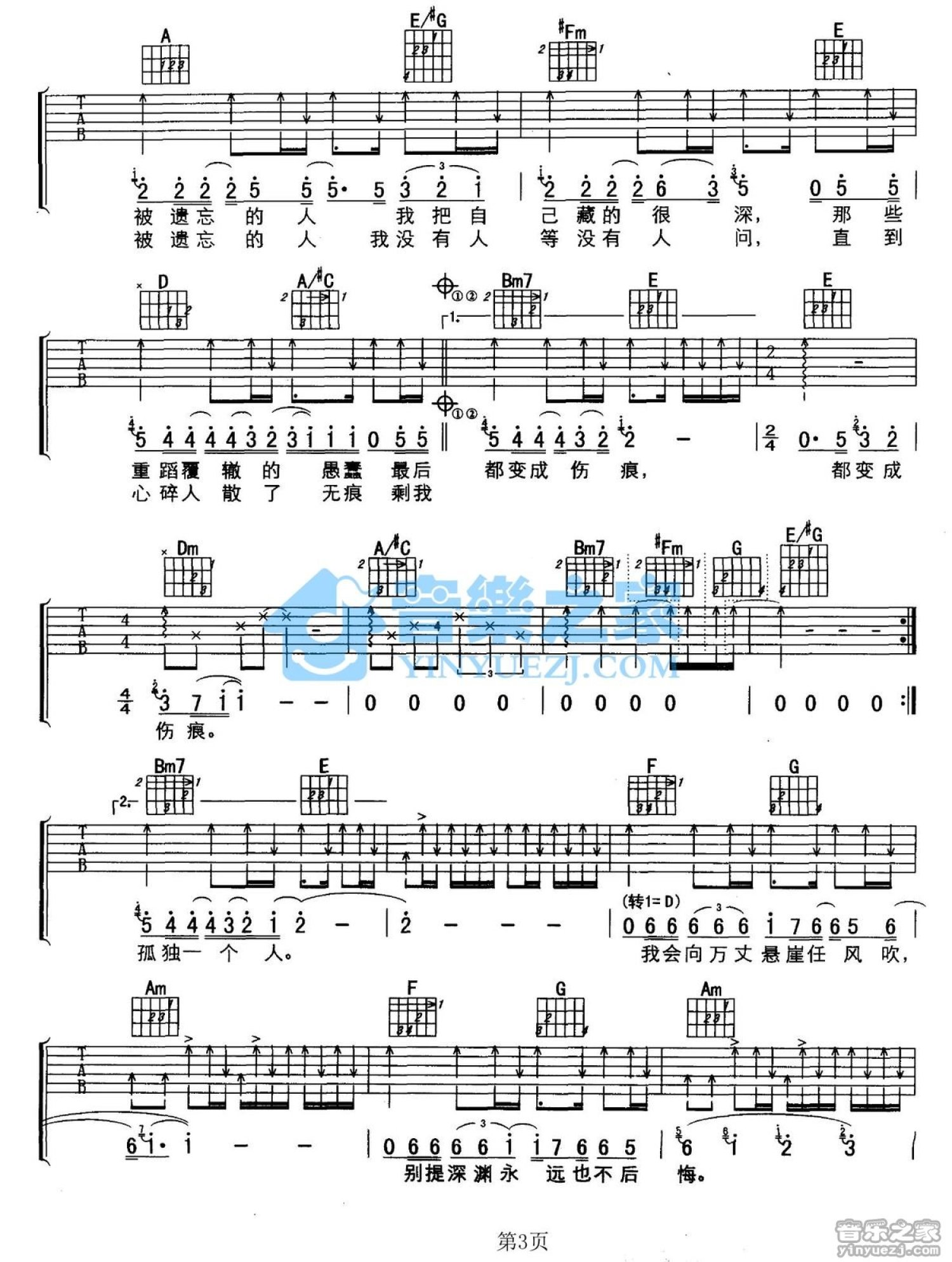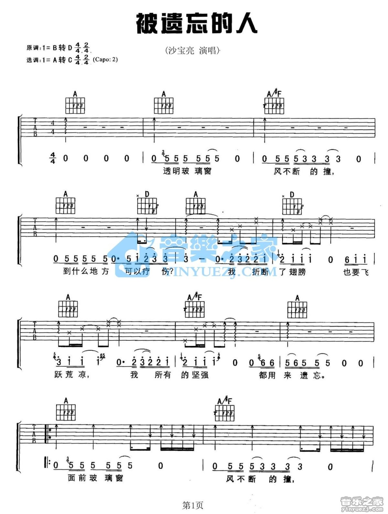 曲谱介绍: A调版《被遗忘的人》吉他弹唱六线谱