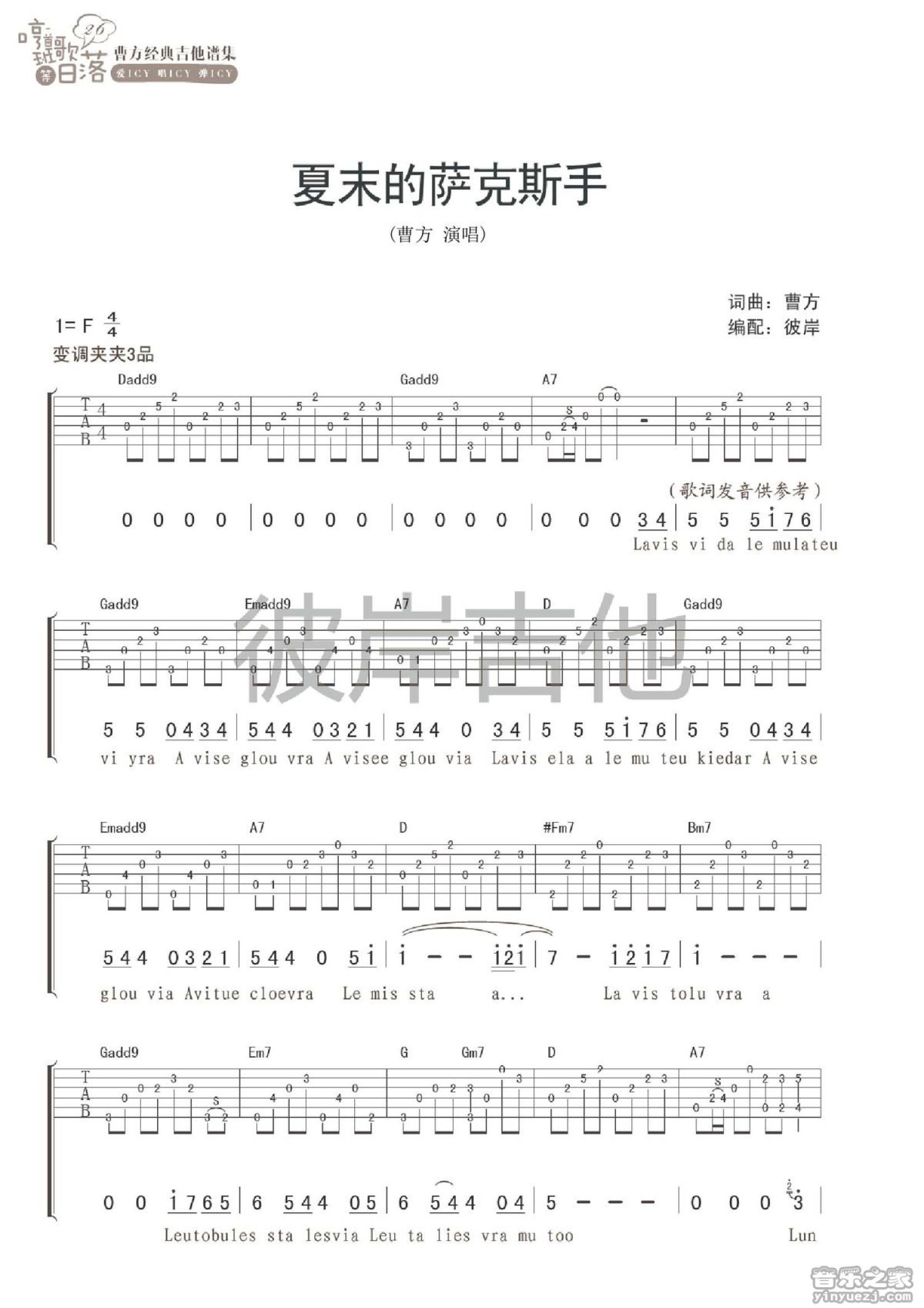 曲谱介绍: F调版《夏末的萨克斯手》吉他弹唱六线谱