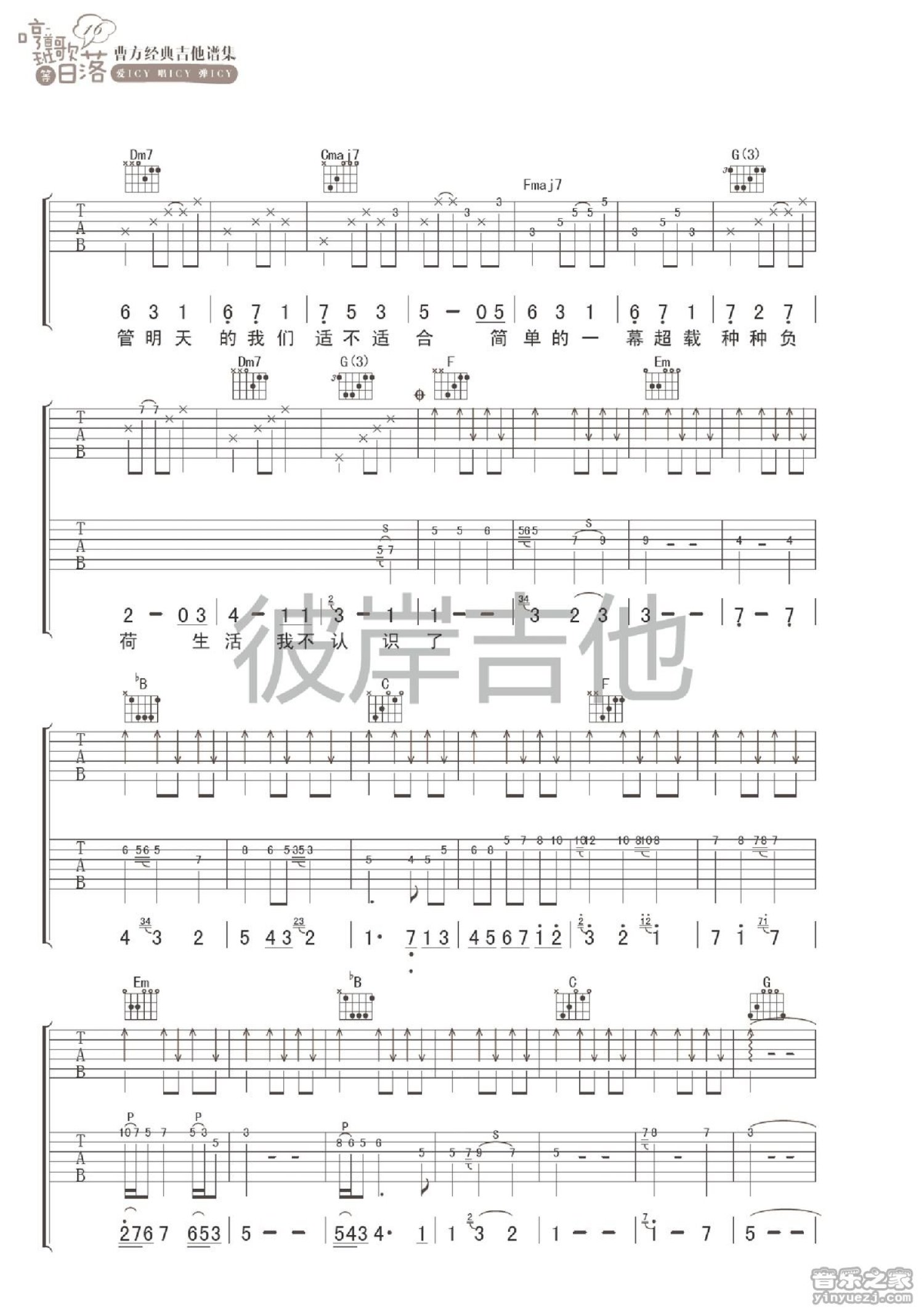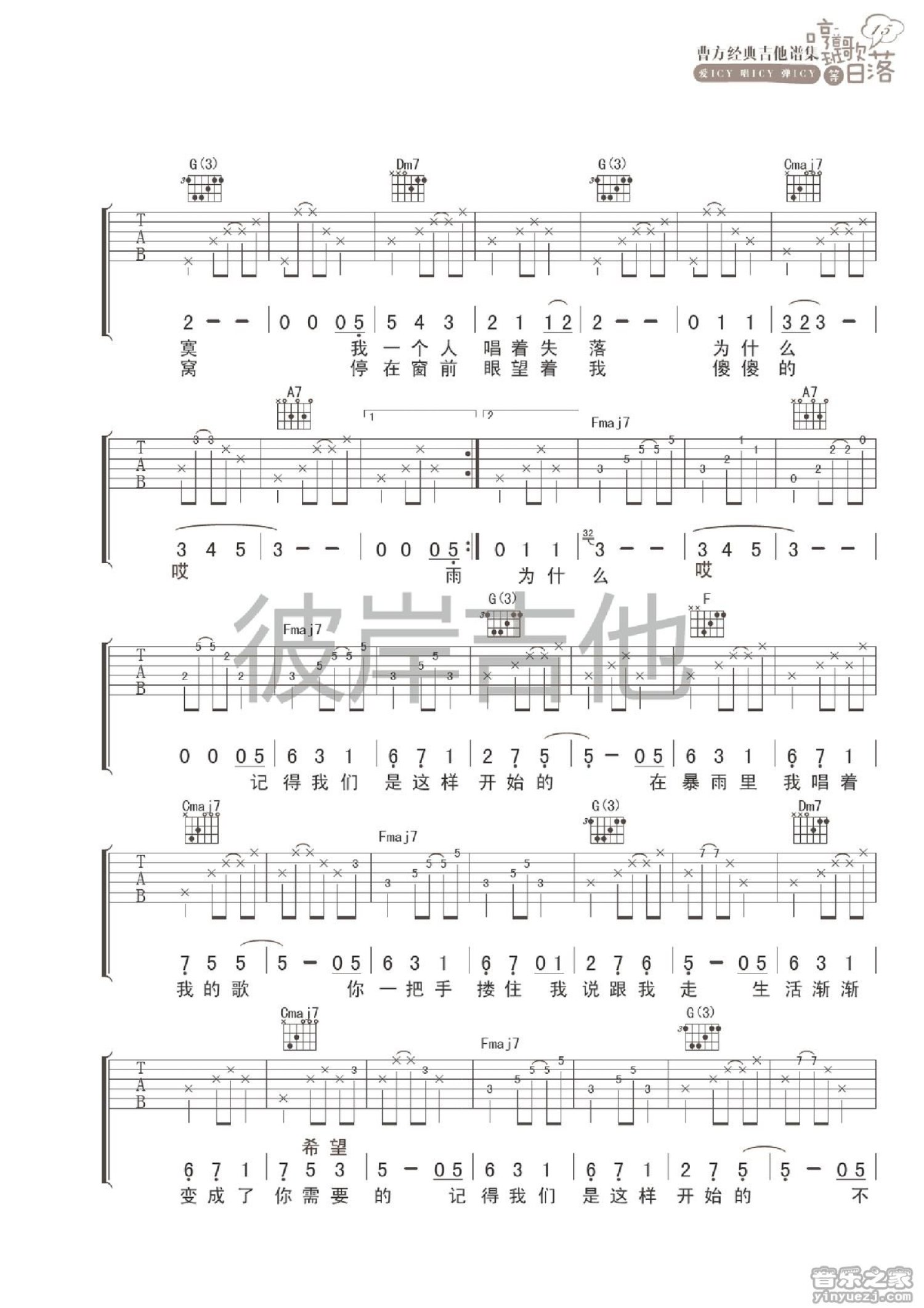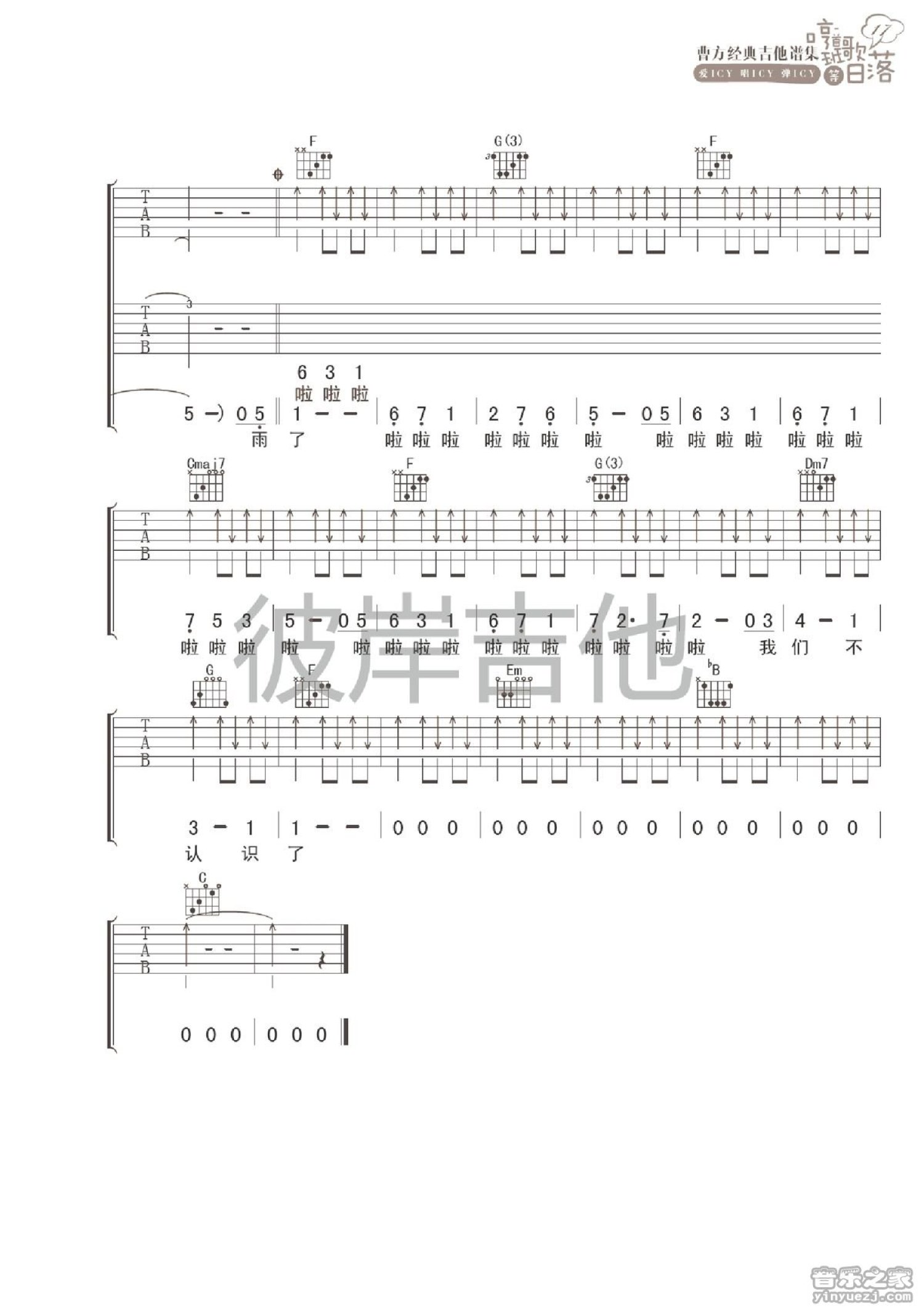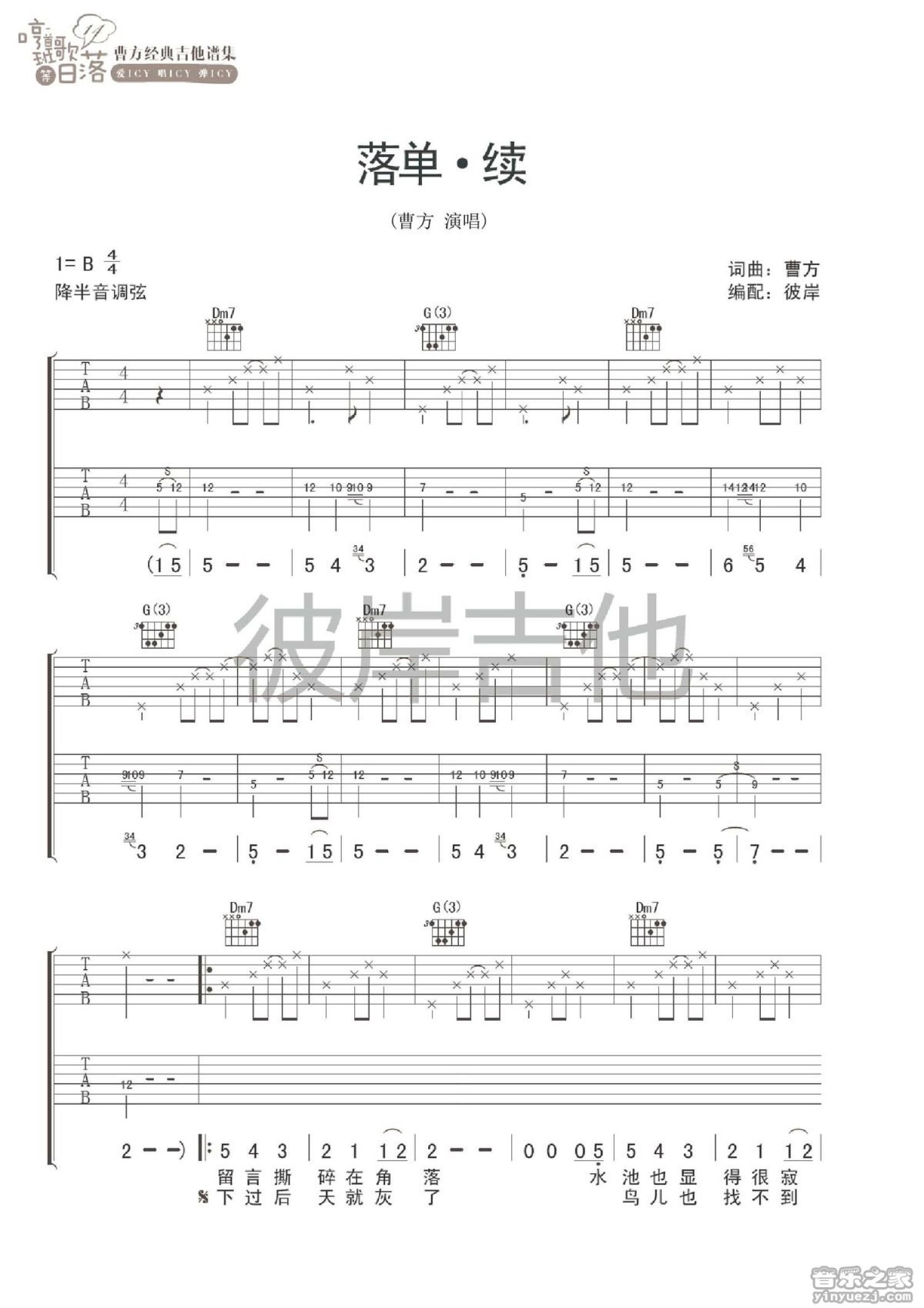 曲谱介绍: B调《落单续》吉他弹唱六线谱
