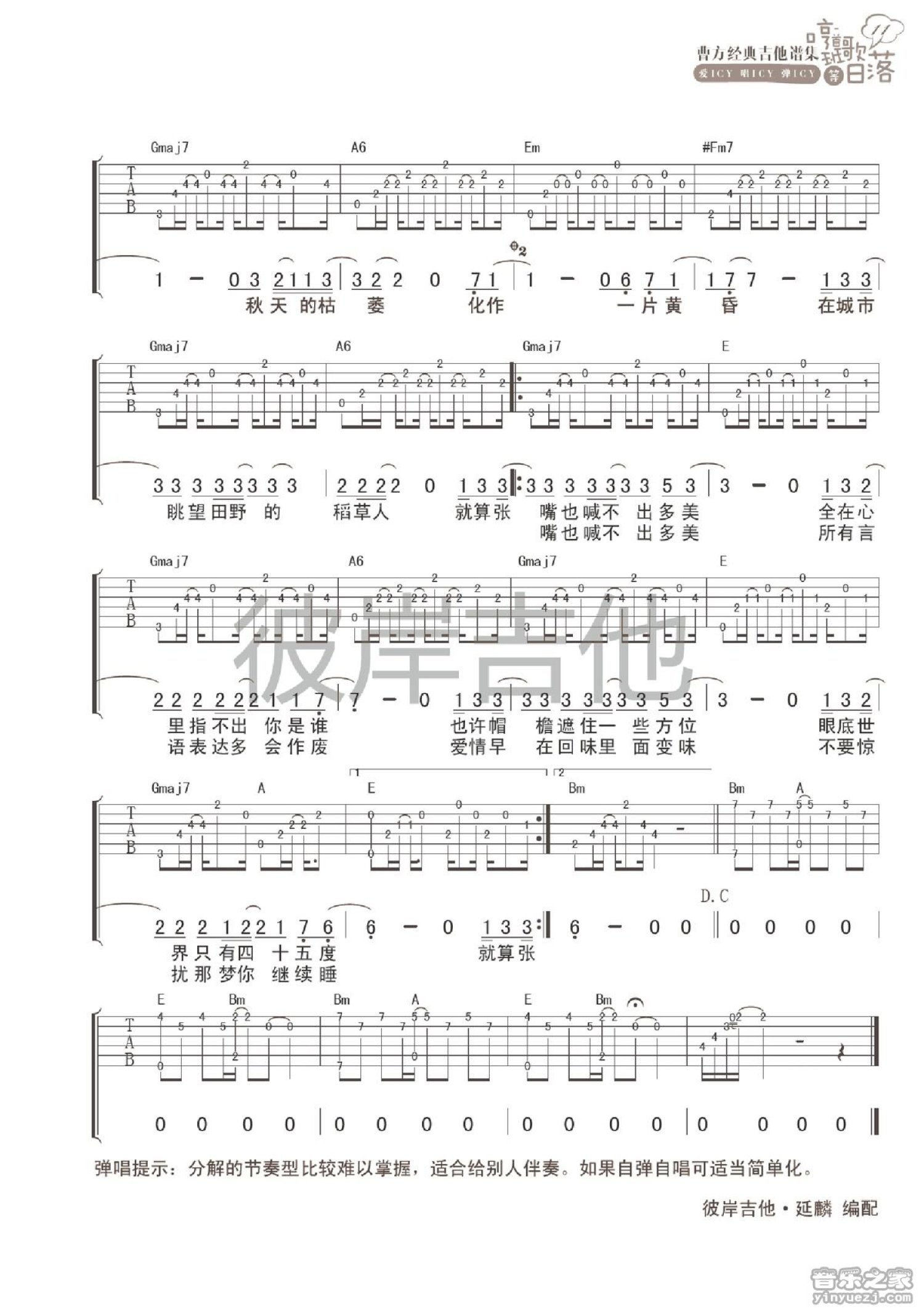 曲谱介绍: D调版《城市稻草人》吉他弹唱六线谱