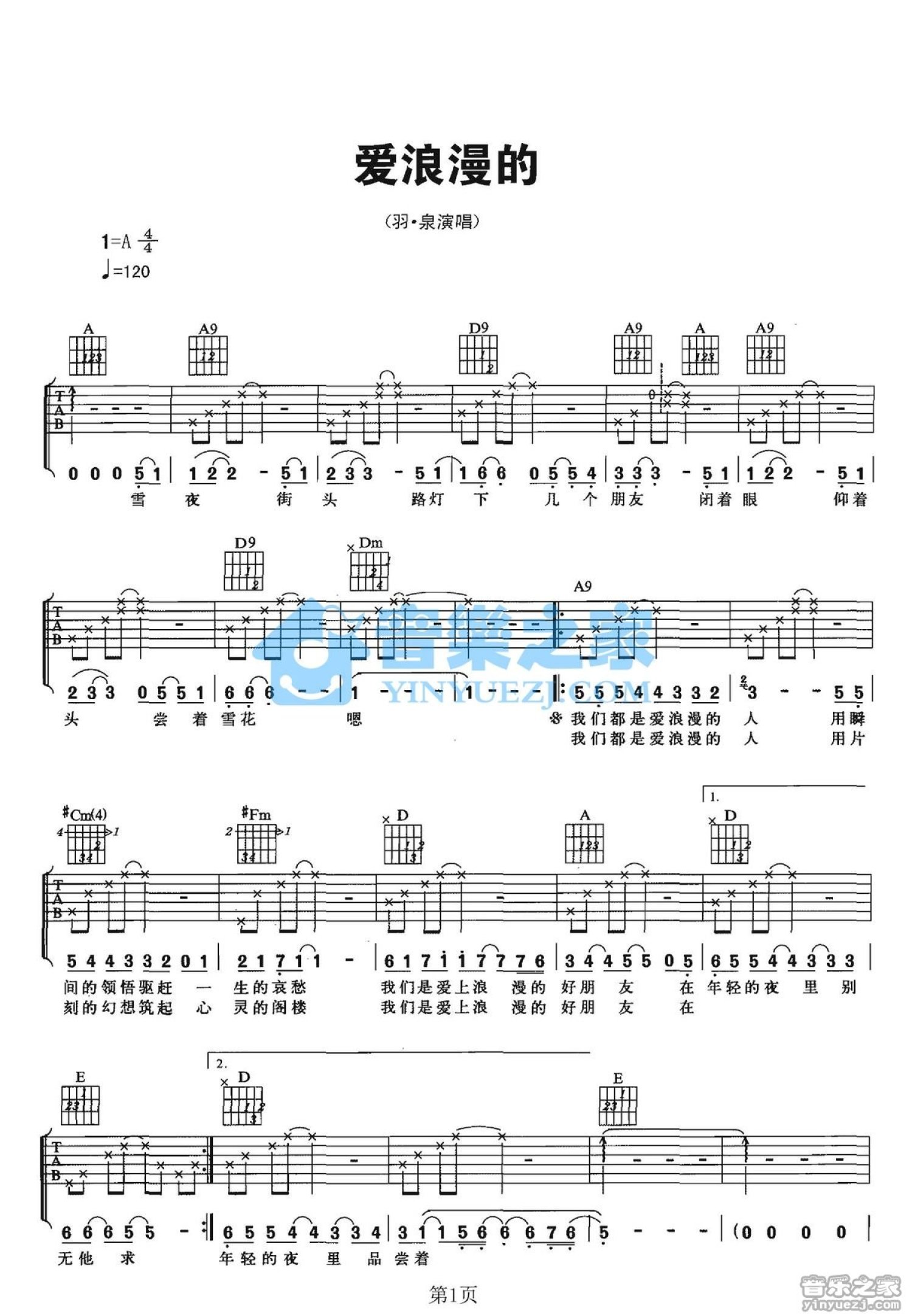 曲谱介绍: A调《爱浪漫的》吉他弹唱六线谱