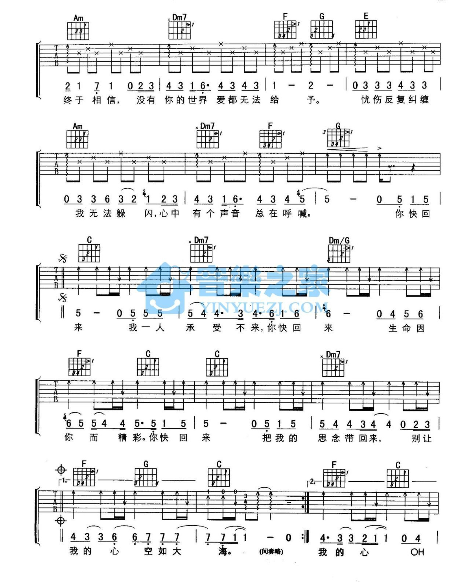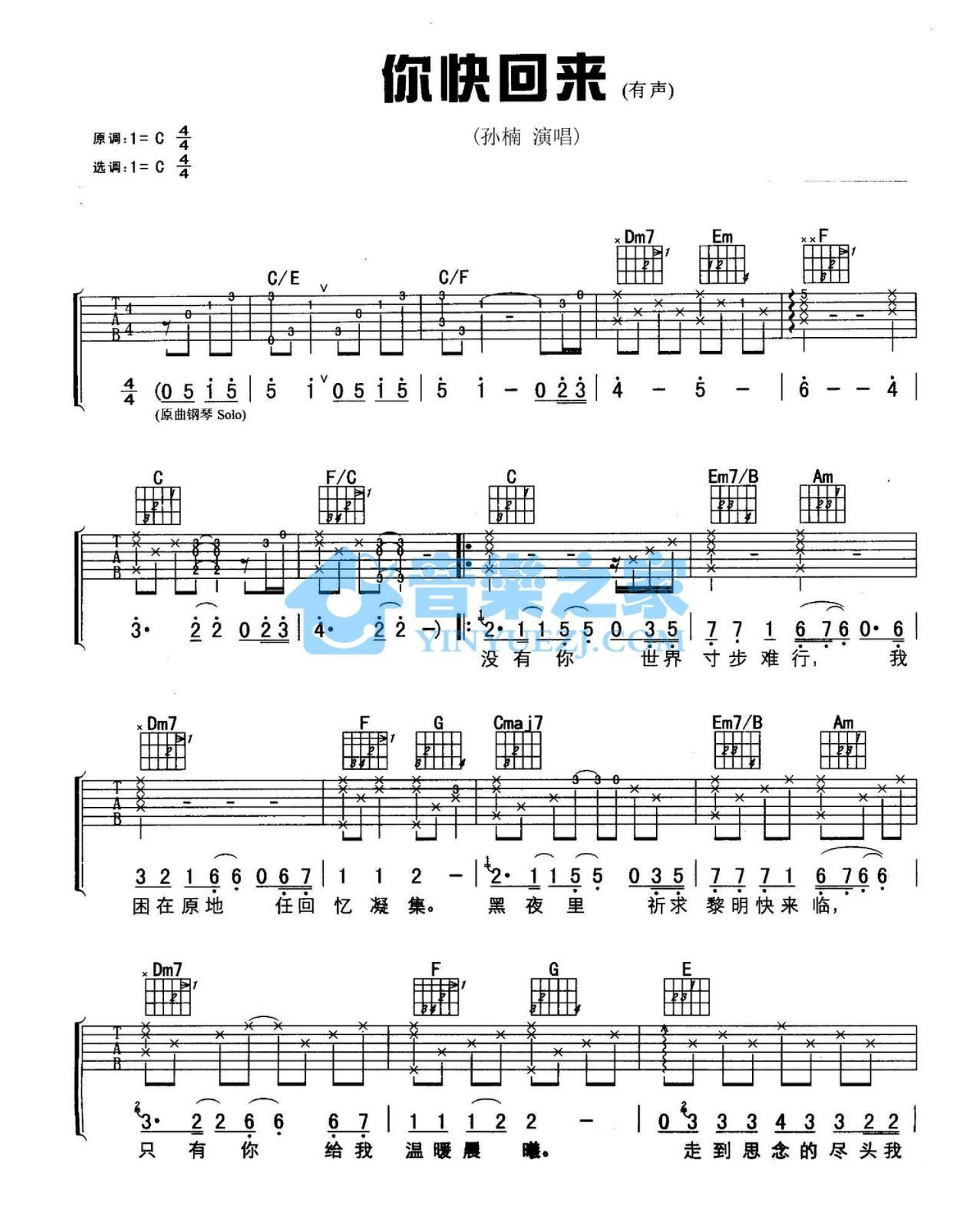 曲谱介绍: C调原版《你快回来》吉他弹唱六线谱