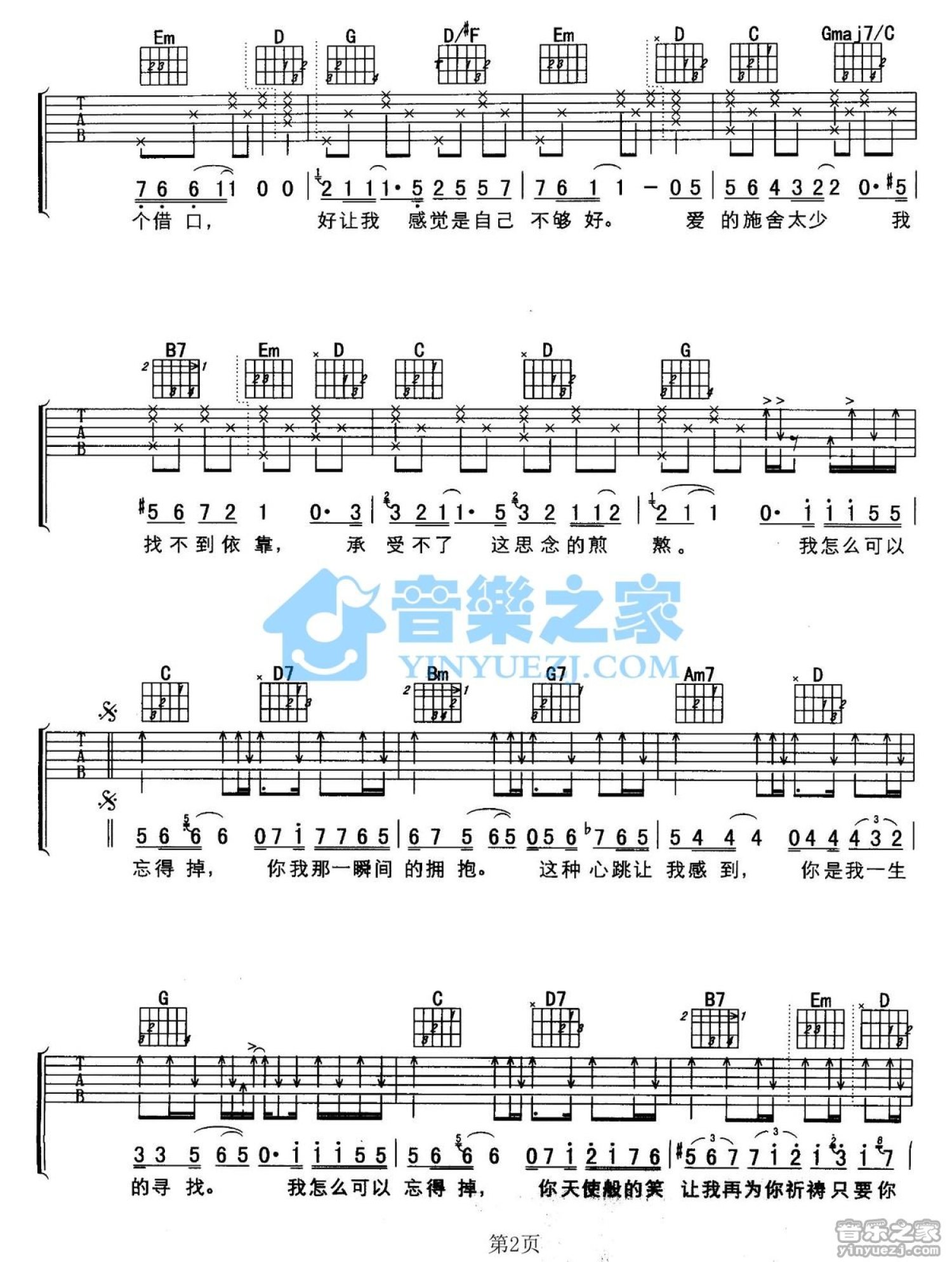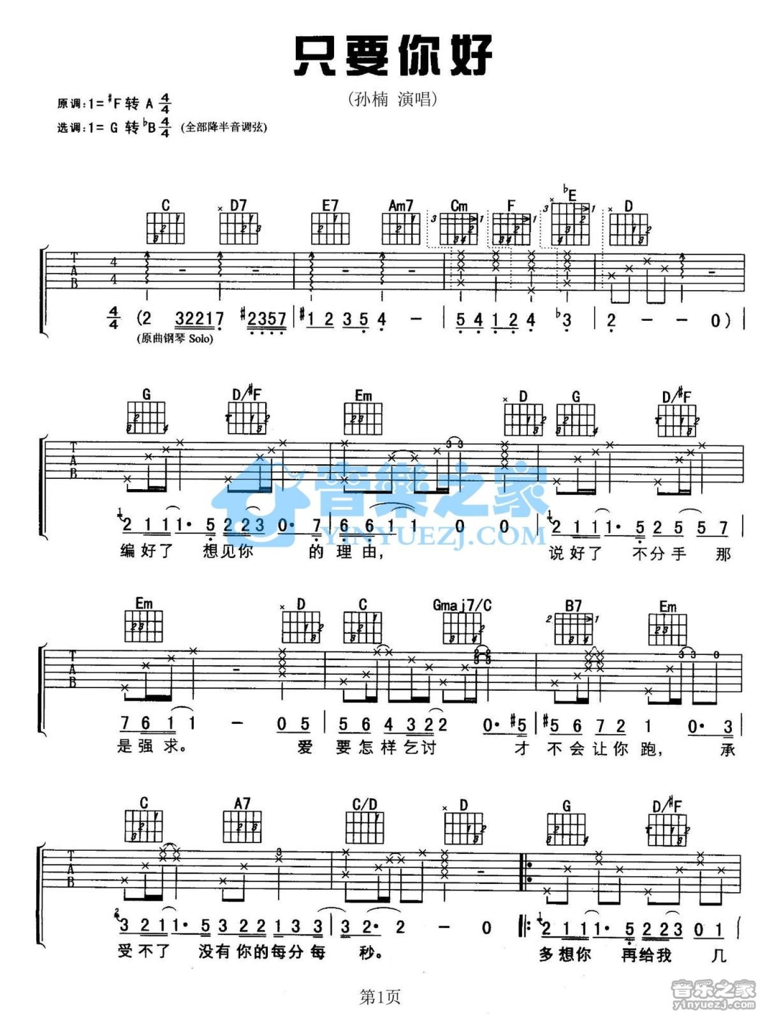 曲谱介绍: G调版《只要你好》吉他弹唱六线谱