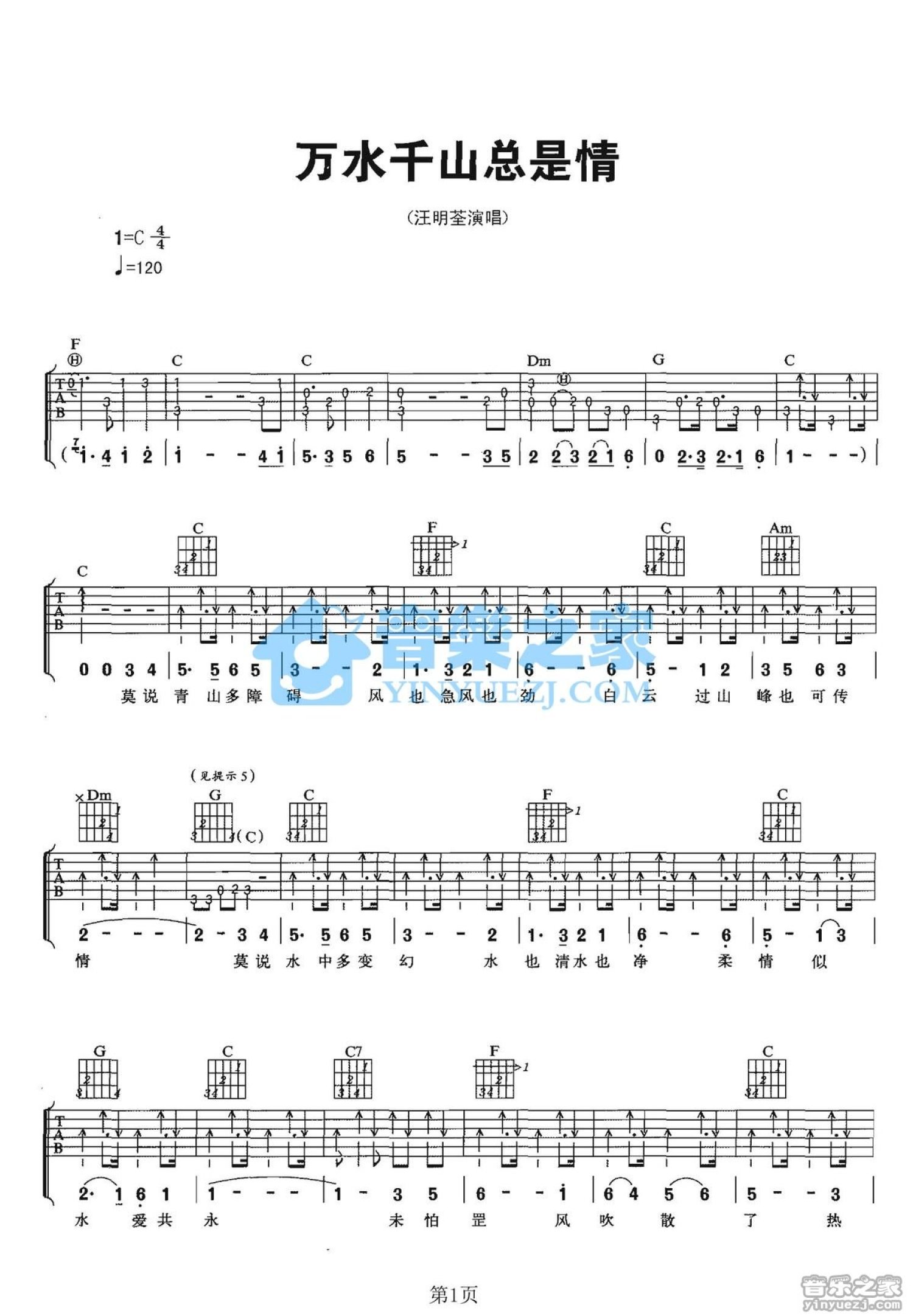 曲谱介绍: C调版《王水千山总是情》吉他弹唱六线谱