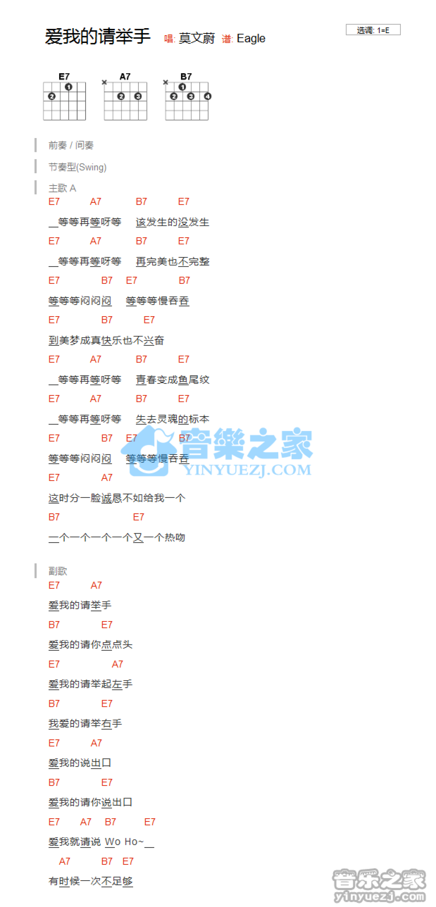 曲谱介绍: E调版《爱我的请举手》吉他和弦弹唱谱