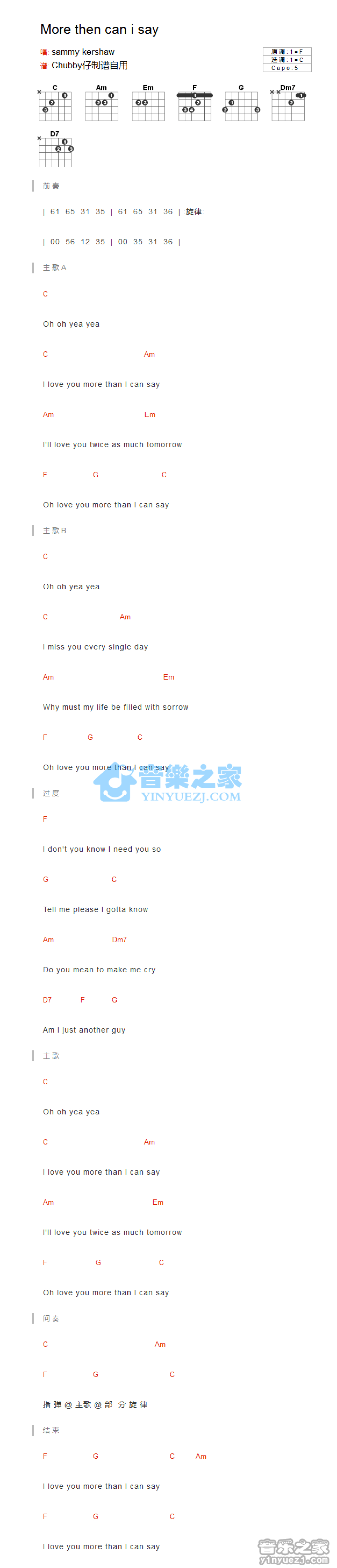 曲谱介绍: C调版《MoreThanCanISay》吉他和弦弹唱谱