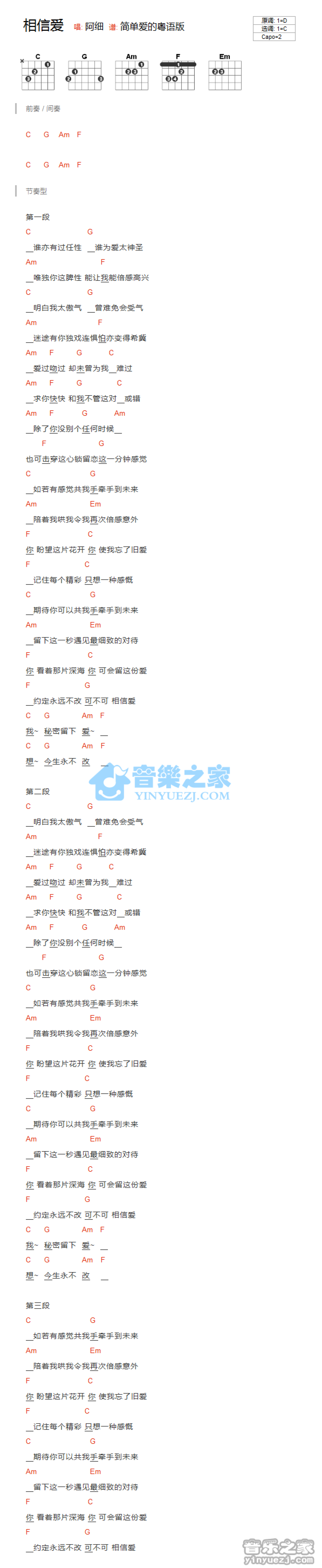 曲谱介绍: C调版《相信爱》吉他和弦弹唱谱简单爱粤语版