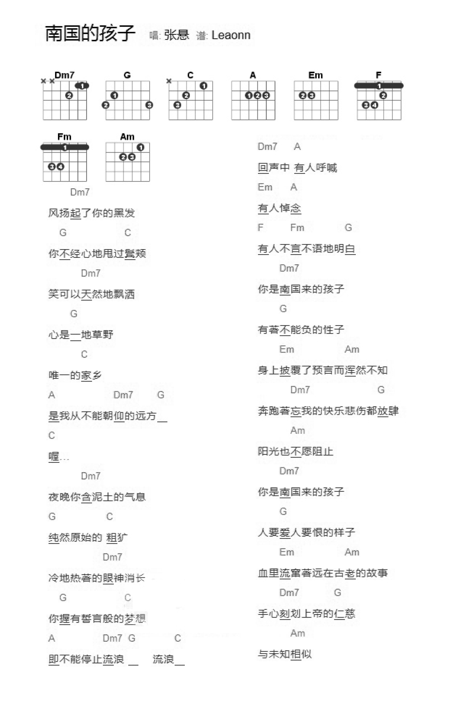 南国的孩子吉他谱 - 张悬 - D调吉他弹唱谱 - 和弦谱