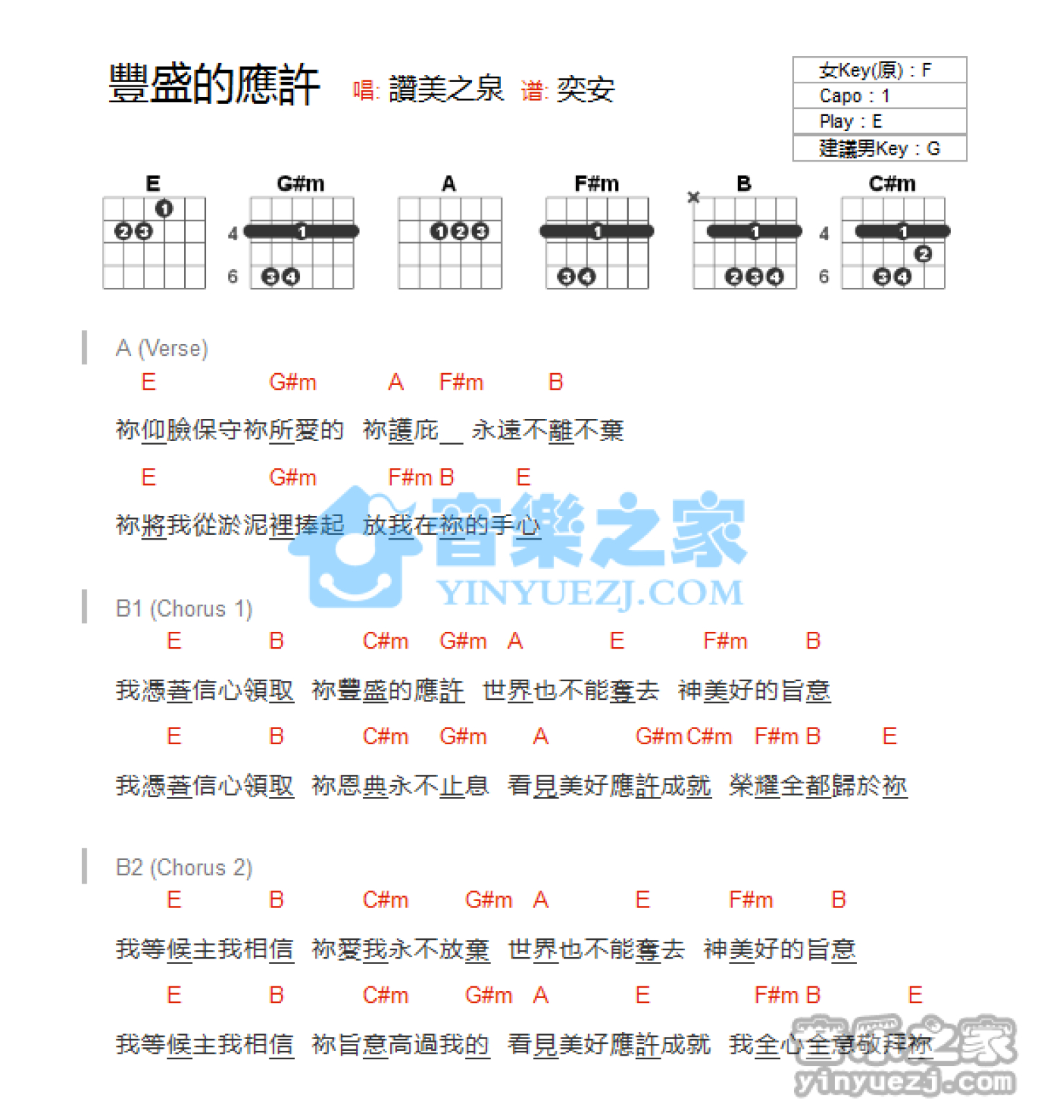 曲谱介绍: E调版《丰盛的应许》吉他和弦弹唱谱