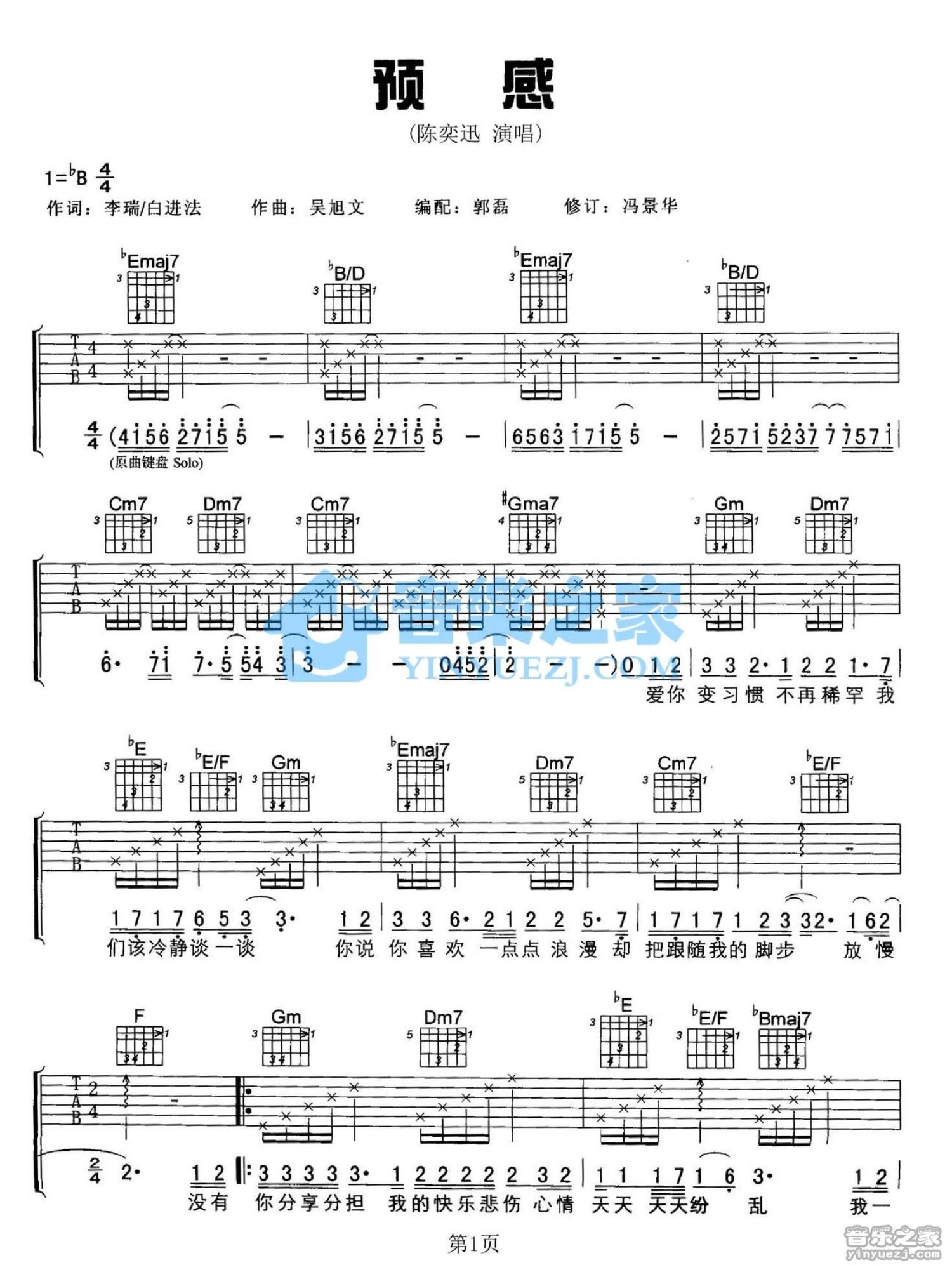 曲谱介绍: bB调版《预感》吉他弹唱六线谱
