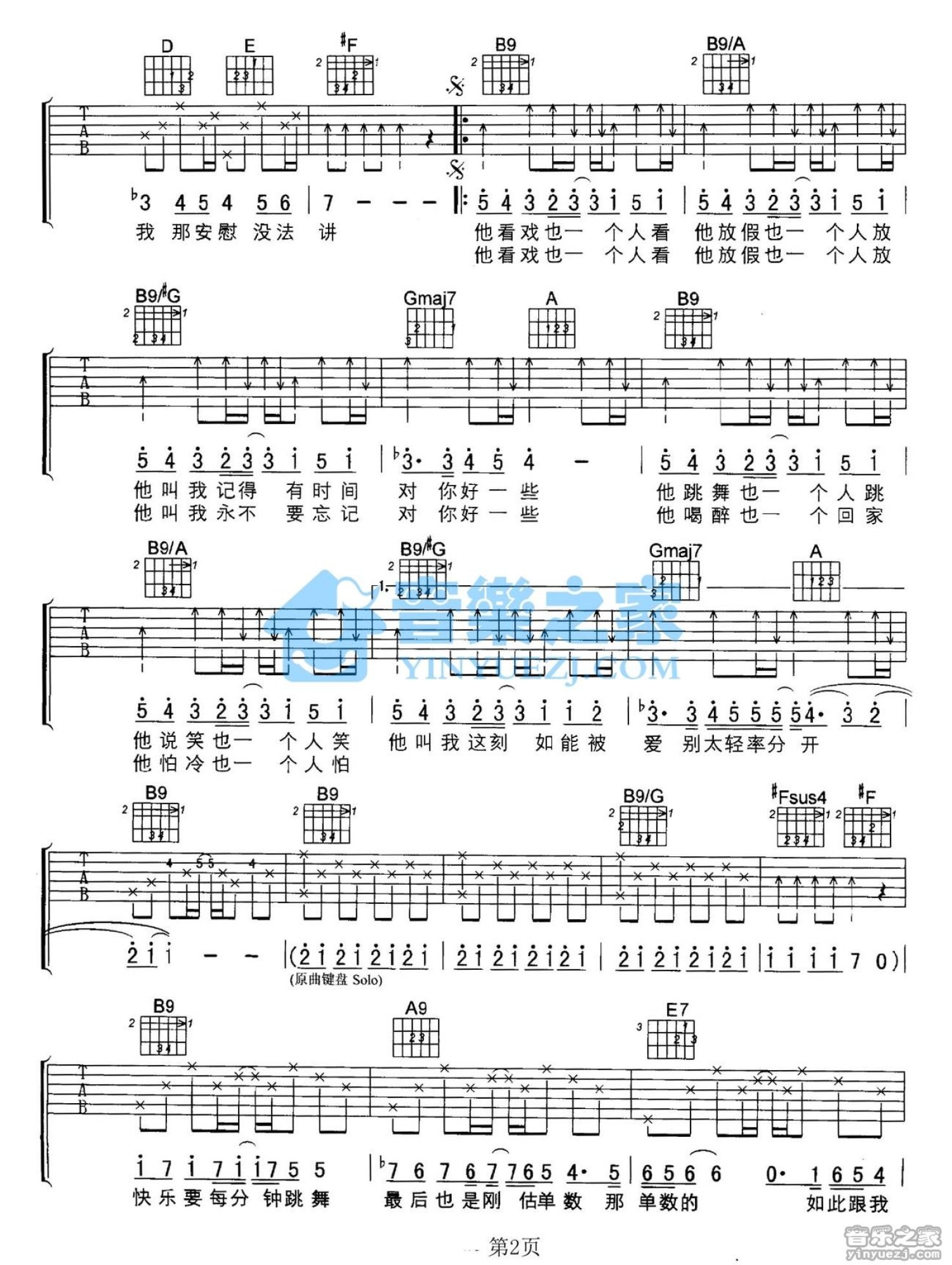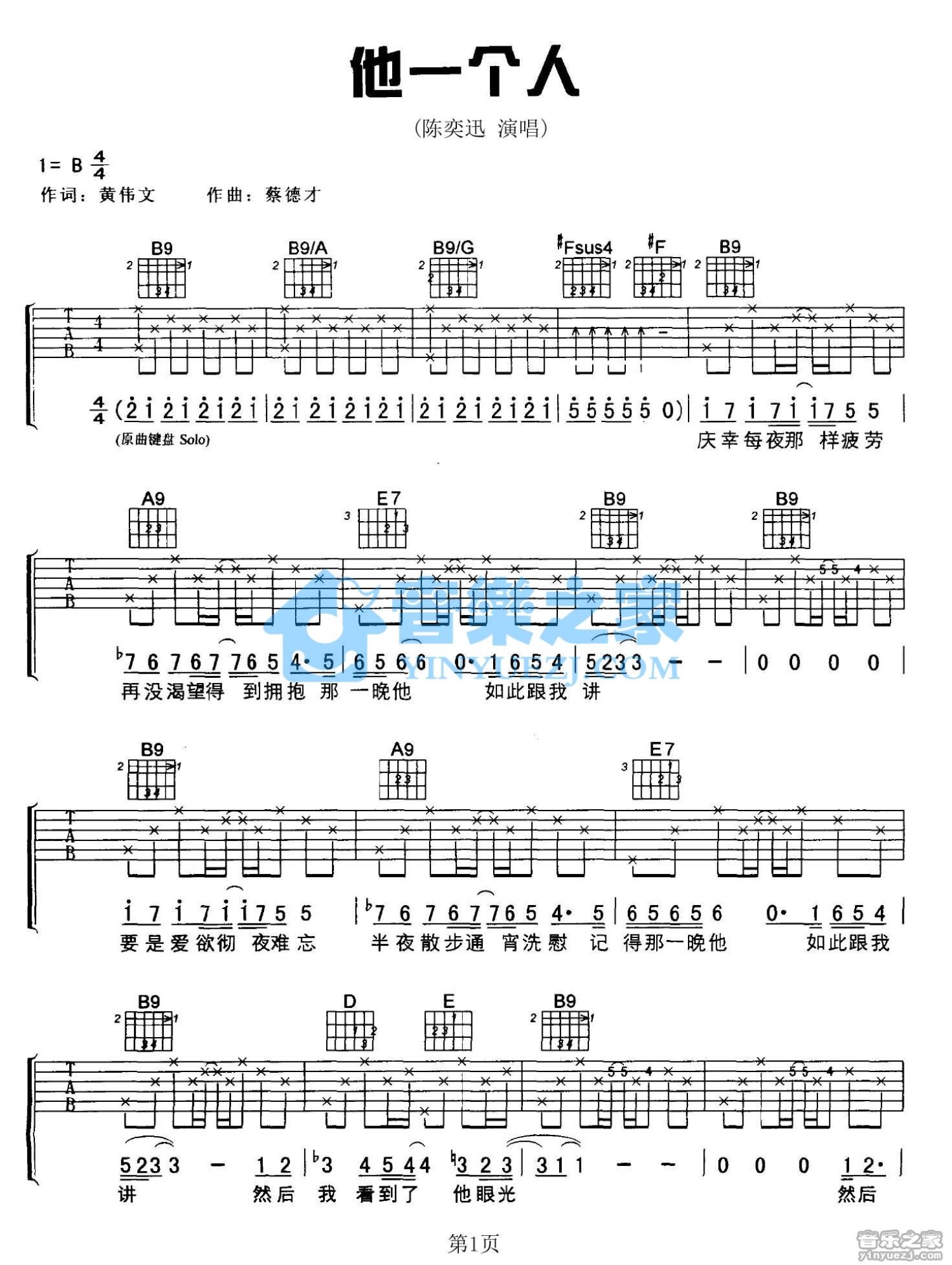 曲谱介绍: B调版《他一个人》吉他弹唱六线谱