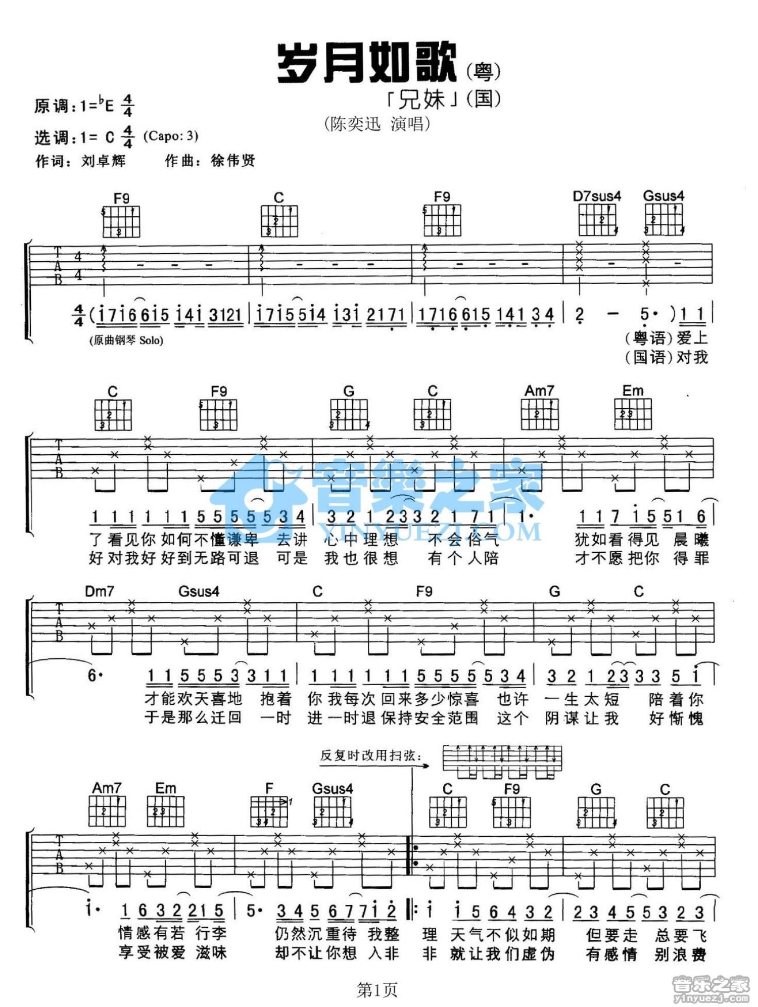 岁月如歌吉他谱 - 陈奕迅 - C调吉他弹唱谱