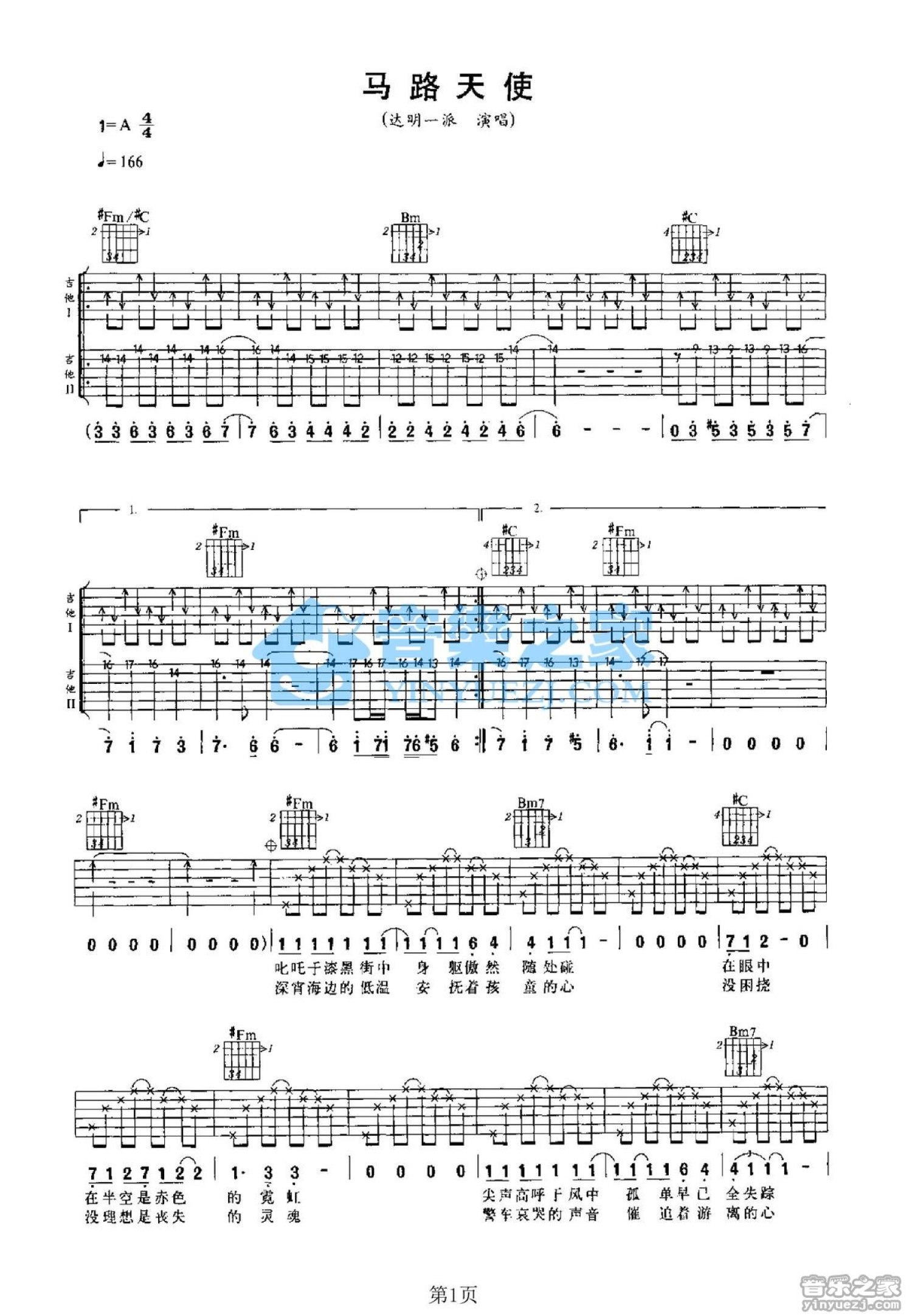 曲谱介绍: A调《马路天使》吉他弹唱六线谱