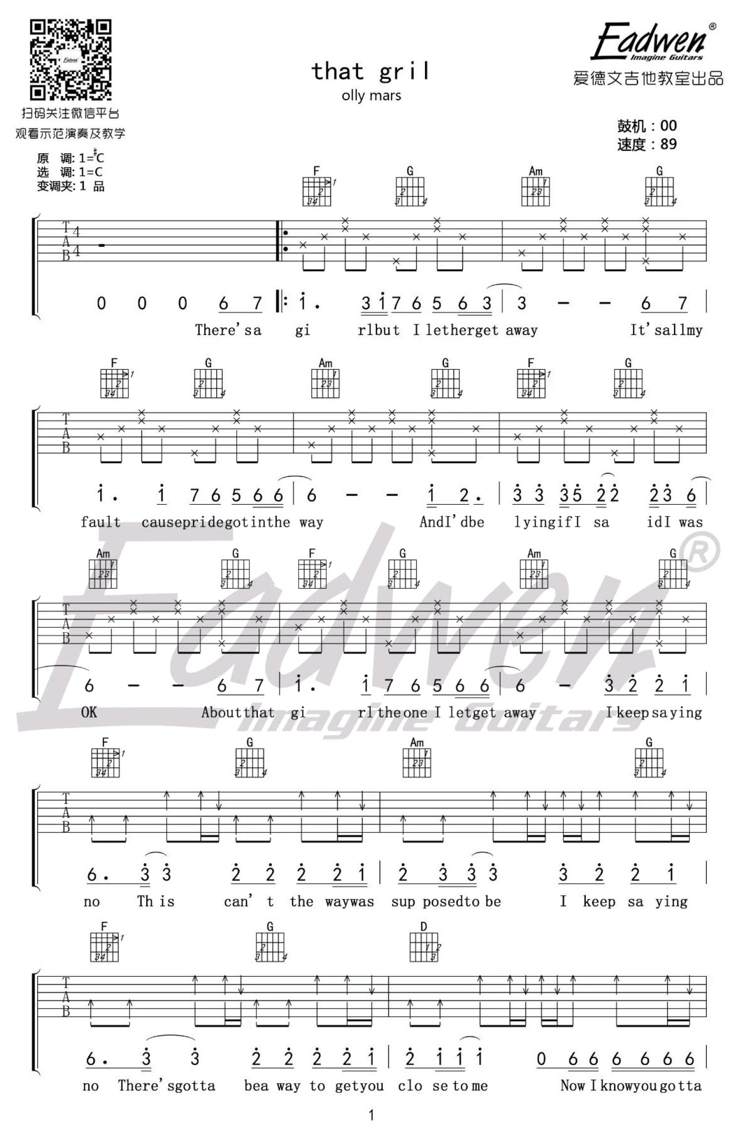 曲谱介绍: Ollymars《ThatGirl》吉他谱,最近网络上很火的一首英文歌曲,原调#C,选用C调指法,变调夹夹一品。随谱附上陈佰老师为大家带来的配套吉他教学视频,琴友们跟随教学示范学习。