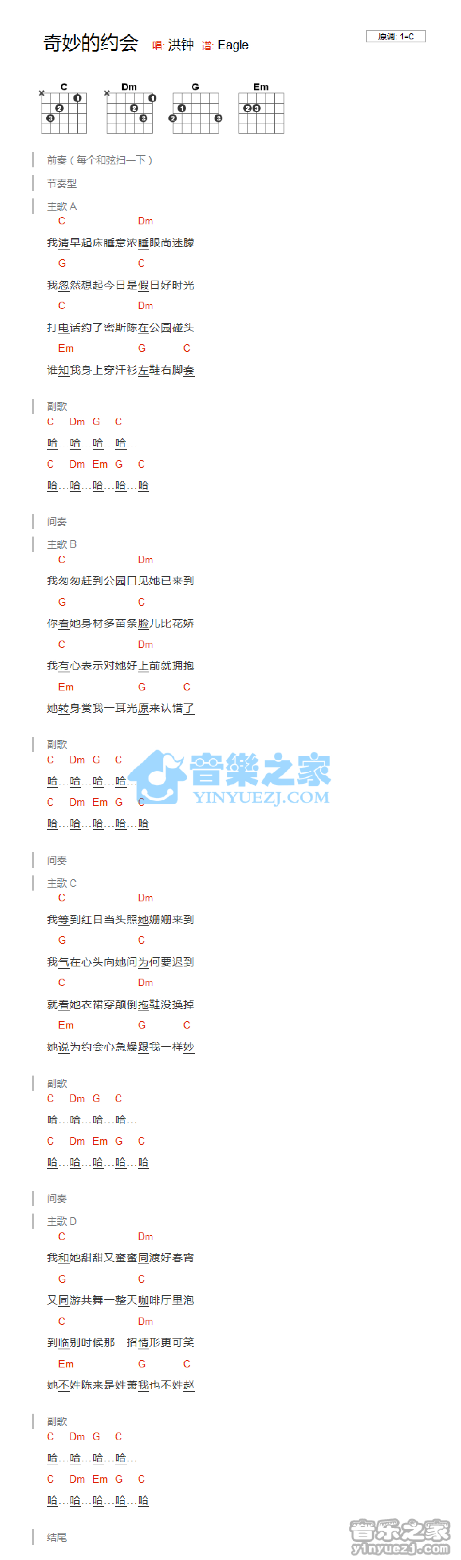 奇妙的约会吉他谱 - 洪钟 - C调吉他弹唱谱 - 和弦谱
