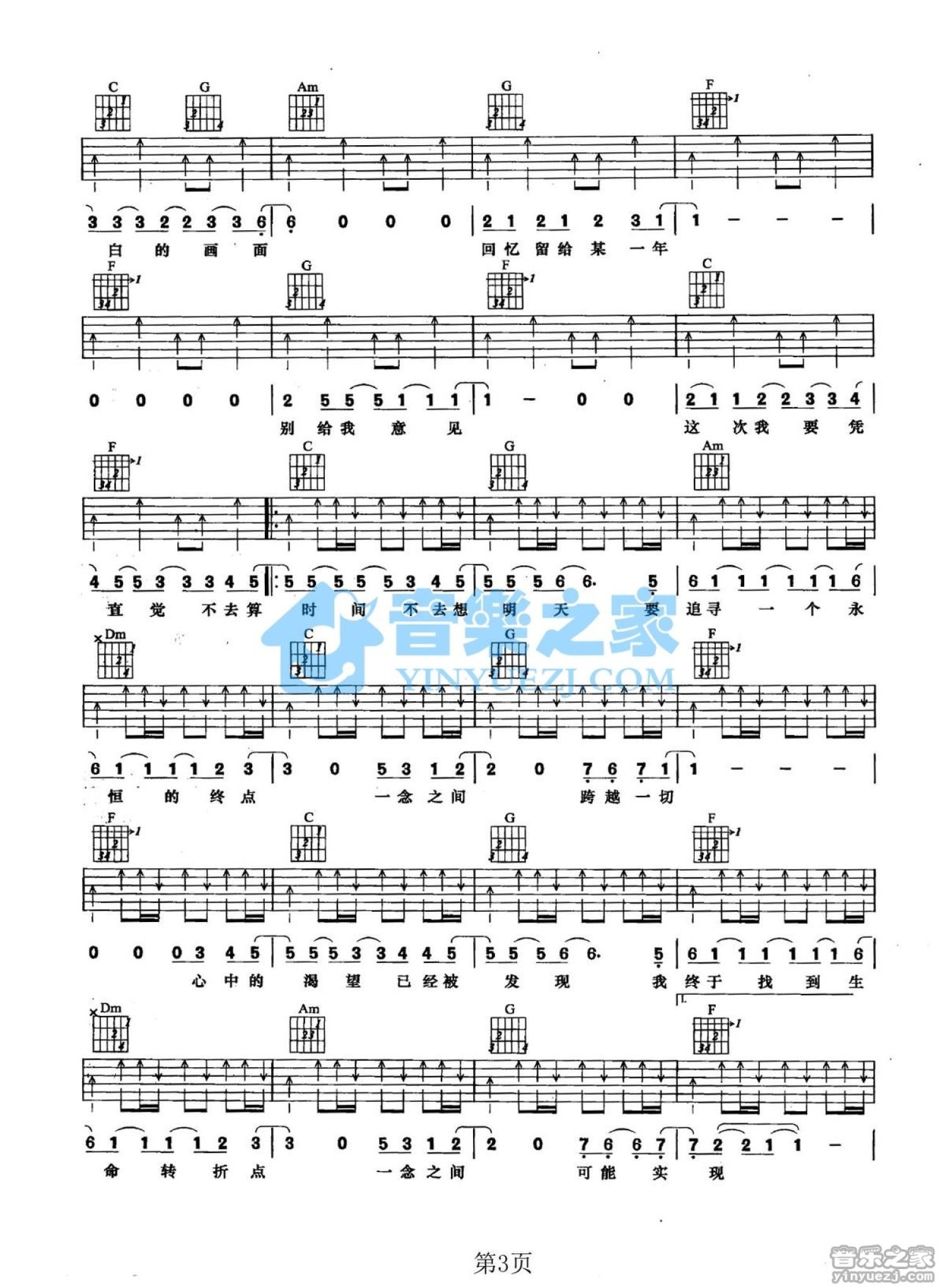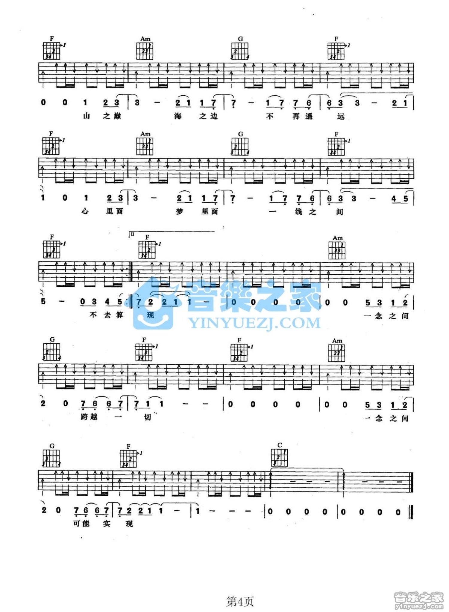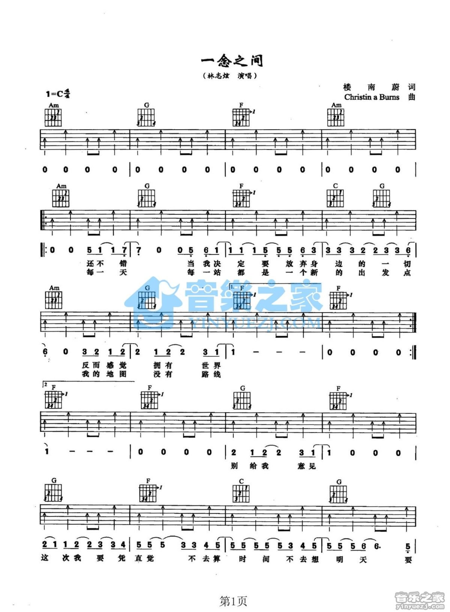 曲谱介绍: C调版《一念之间》吉他弹唱六线谱
