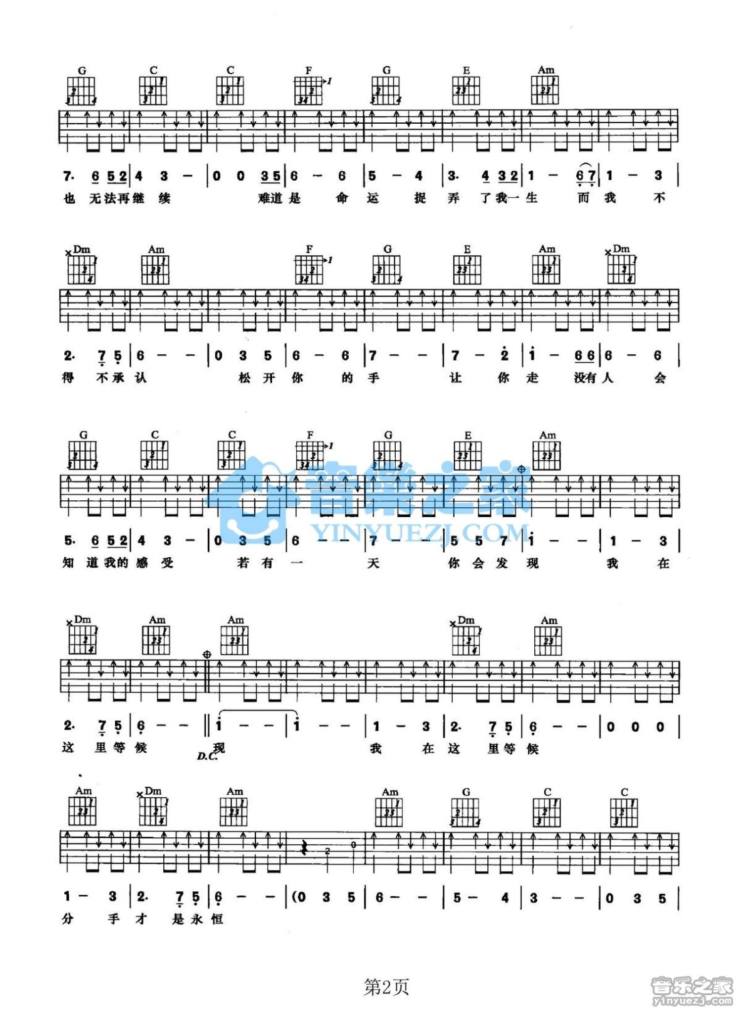 曲谱介绍: C调版《分手才得永恒》吉他弹唱六线谱