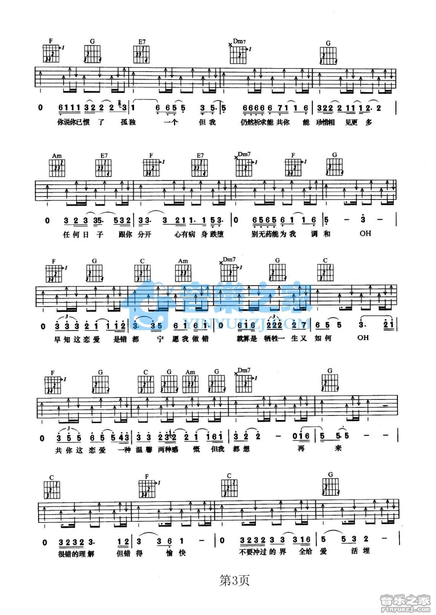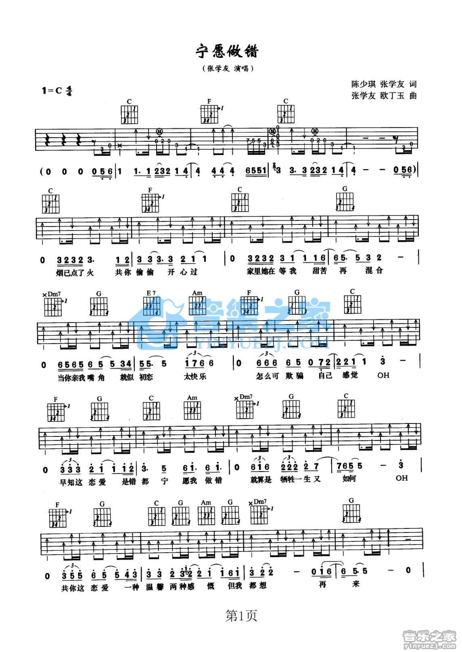 曲谱介绍: C调《宁愿做错》吉他弹唱六线谱