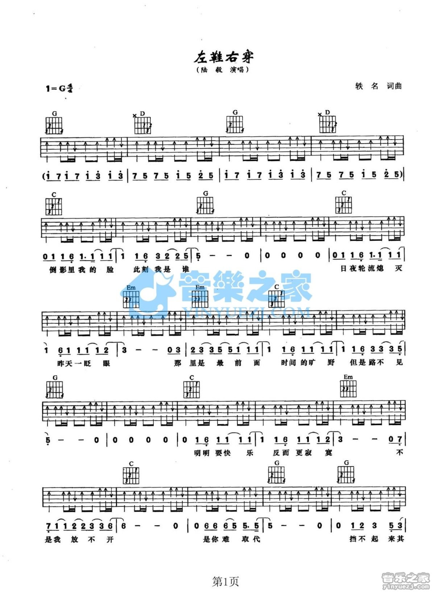 曲谱介绍: G调版《左鞋右穿》吉他弹唱六线谱